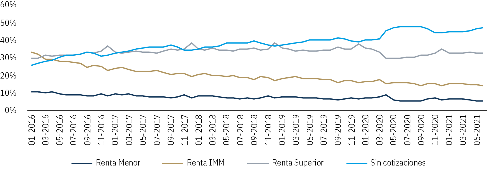 [15] Es decir, no incluye a quienes por ley no se encuentran en el sistema, entre ellos: los trabajadores cuyas relaciones laborales se iniciaron con anterioridad a octubre de 2002 y que no se afiliaron voluntariamente al SC de forma posterior, los trabajadores del sector público, los funcionarios de las Fuerzas Armadas y de Orden, los trabajadores independientes, los menores de 18 años, los trabajadores con contrato de aprendizaje, los trabajadores pensionados (con excepción de los pensionados por invalidez parcial), los trabajadores que participan como socios mayoritarios o igualitarios y que administran o representan a la empresa que informan como empleador.