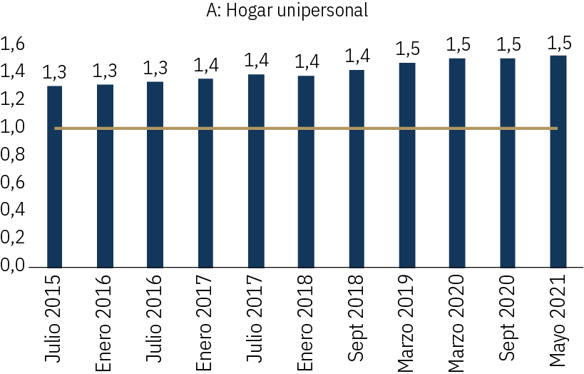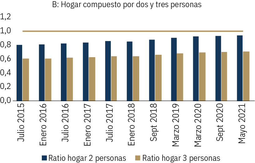 [12] El ingreso por persona equivalente corresponde a la proporción entre el ingreso total del hogar y el número de personas equivalentes. Éste último corresponde al número de miembros del hogar elevado a la potencia o coeficiente de ponderación (o elasticidad de equivalencia), que permite tomar en cuenta la presencia de economías de escala en el consumo, el que toma el valor de 0,7 para todos los miembros del hogar.