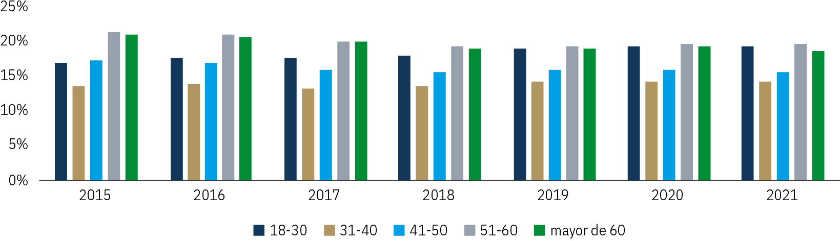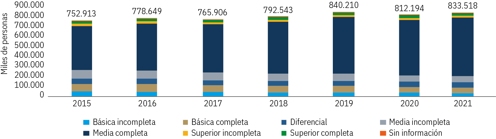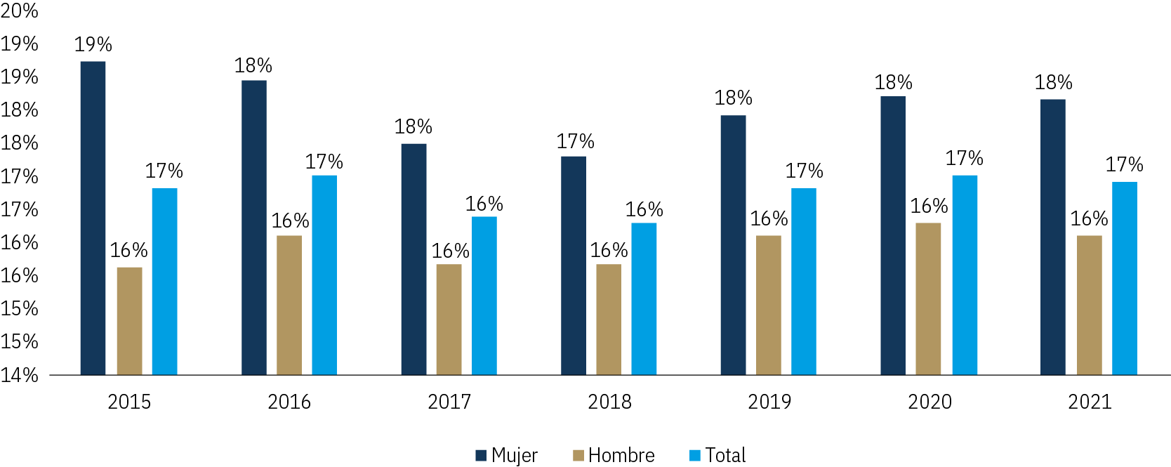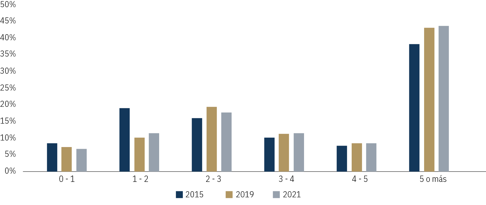 - Entre 2015 y 2021, existió una mejora en los ingresos de manera transversal por sexo, tramo etario, región, experiencia laboral y situación migratoria, donde disminuye la proporción de individuos con ingresos equivalentes a la LP de un hogar de uno a dos integrantes, y aumenta la proporción de trabajadores con ingresos equivalentes a la LP para hogares compuestos por dos a tres individuos.