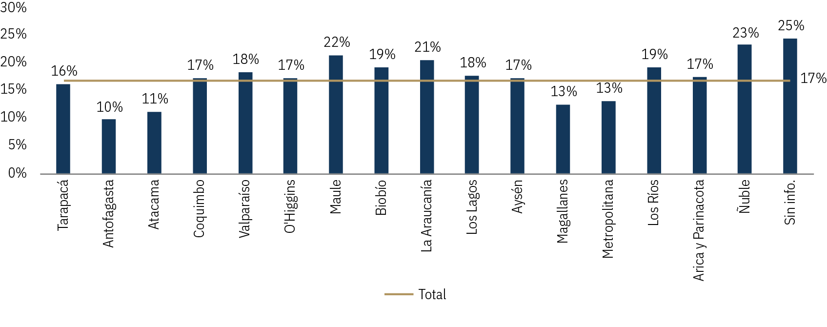 - Proporcionalmente existen más hombres que mujeres con ingresos superiores a la LP para hogares desde cinco integrantes. Asimismo, en torno a un 50% de las personas de entre 31 y 50 años percibe ingresos superiores a dicho valor, en contraste con alrededor de un 30% de las personas de menos de 30 años que pertenecen a este tramo de ingresos. En cuanto a la región de residencia, se encuentra que la mayor incidencia de menores ingresos el 2021 se concentra en Maule, la Araucanía y Ñuble, las cuales también concentran en mayor proporción a los trabajadores afectos al IMM.