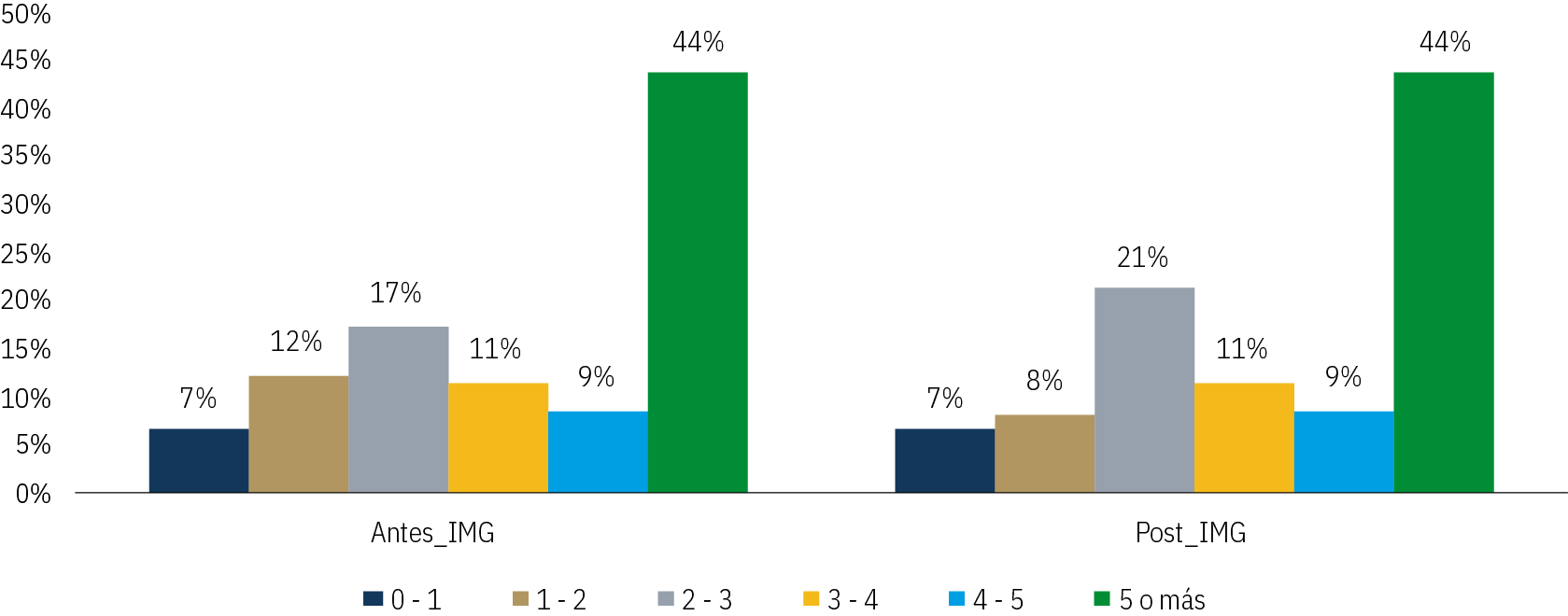 - Como se observa en el Gráfico 12, el principal efecto de la recepción del IMG se ve reflejado en una disminución en los trabajadores que perciben ingresos entre la LP para un hogar de dos y tres personas, pasando desde un 12% a un 8%. Asimismo, se observa un aumento en el total de trabajadores que perciben ingresos entre la LP para un hogar de tres a cuatro personas, desde un 17% a un 21%, producto de la recepción del subsidio.