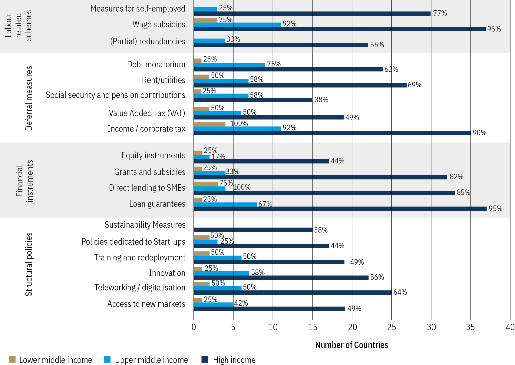 Según se observa, algunas medidas son más utilizadas que otras. Por ejemplo, los subsidios salariales (Wage subsidies) han sido empleados por 51 de 55 países para los cuales se dispone información, al igual que las extensiones en los plazos de pago, los cuales han sido utilizados por 50 de los 55 países de la muestra. Por su parte, durante el periodo de análisis, los préstamos directos (Direct lending to SMEs) y las garantías de préstamos (Loan guarantees) fueron utilizadas por 48 y 46 países, respectivamente. En particular, las garantías de préstamos se utilizaron con mayor frecuencia en países de ingresos altos (37 de 39) y medio-altos (8 de 12), no así en países de ingresos medio-bajos. Las medidas orientadas a trabajadores por cuenta propia (Measures for self-employed) también se utilizaron en países de ingresos altos (30 de 39), mientras que son poco comunes en países de ingresos medio-altos (3 de 12) y no se utilizaron en países de ingresos medio-bajos.
