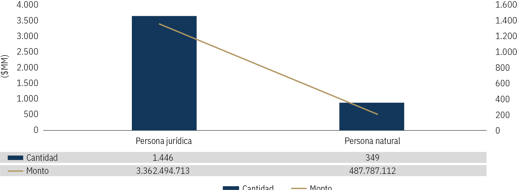 A noviembre de 2021, el Bono para el Pago de Cotizaciones había sido otorgado a 29.740 personas jurídicas y naturales, de los cuales las primeras habían concentrado el 76% de los beneficiarios (lo cual resulta similar a lo observado en el Bono de Anticipo previamente descrito). En relación a los montos entregados, se observa que, a la misma fecha, por concepto de este beneficio se habían movilizado un total de $23.352 millones, de los cuales un 87% se habían entregado a las personas jurídicas y el restante 13% a las personas naturales (Gráfico 14).