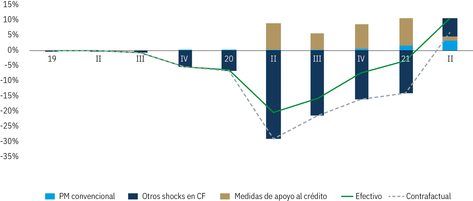 Si bien es difícil establecer una causalidad en el impacto a las empresas con la información disponible, si es posible verificar que dichas medidas fueron ampliamente utilizadas por los beneficiarios a los que se tuvo por objetivo favorecer, así se destaca el gasto de las medidas tributarias, las cuales involucraron un desembolso de US1.214 millones. Por su parte el FOGAPE involucró un monto de financiamiento equivalente a US$20.236 millones y a más de 500 mil créditos a empresas otorgados entre 2020 y 2021. Adicionalmente, la introducción de este fondo permitió que se siguieran otorgando créditos por tasas significativamente menores a las que accedían dichas empresas previo a la pandemia y con ello la posibilidad de mantener la liquidez, mitigando el efecto de la crisis sobre las empresas de menor tamaño y protegiendo así los empleos de millones de chilenos. Junto con lo anterior, fue posible evidenciar que las empresas que recibieron el FOGAPE tuvieron un desempeño superior a aquellos que no accedieron a los créditos garantizados por el fondo. Lo anterior, en conjunto con otras medidas, según estimaciones del Banco Central, aportó al crecimiento del PIB entre 2,2 y 4,8 puntos porcentuales en 2020 y 2,7 y 4,4 en la primera mitad del 2021