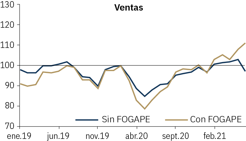 En segundo lugar, se modificaron ciertos aspectos del Fondo de Garantías para Pequeños Empresarios (FOGAPE), para flexibilizar temporalmente sus requisitos y potenciar la reactivación y recuperación económica, específicamente mediante la creación de nuevas garantías enfocadas en aquellas empresas con caídas importantes en sus ventas e inversión, que lograron mantener la liquidez en el aparato productivo en el contexto de una crisis.