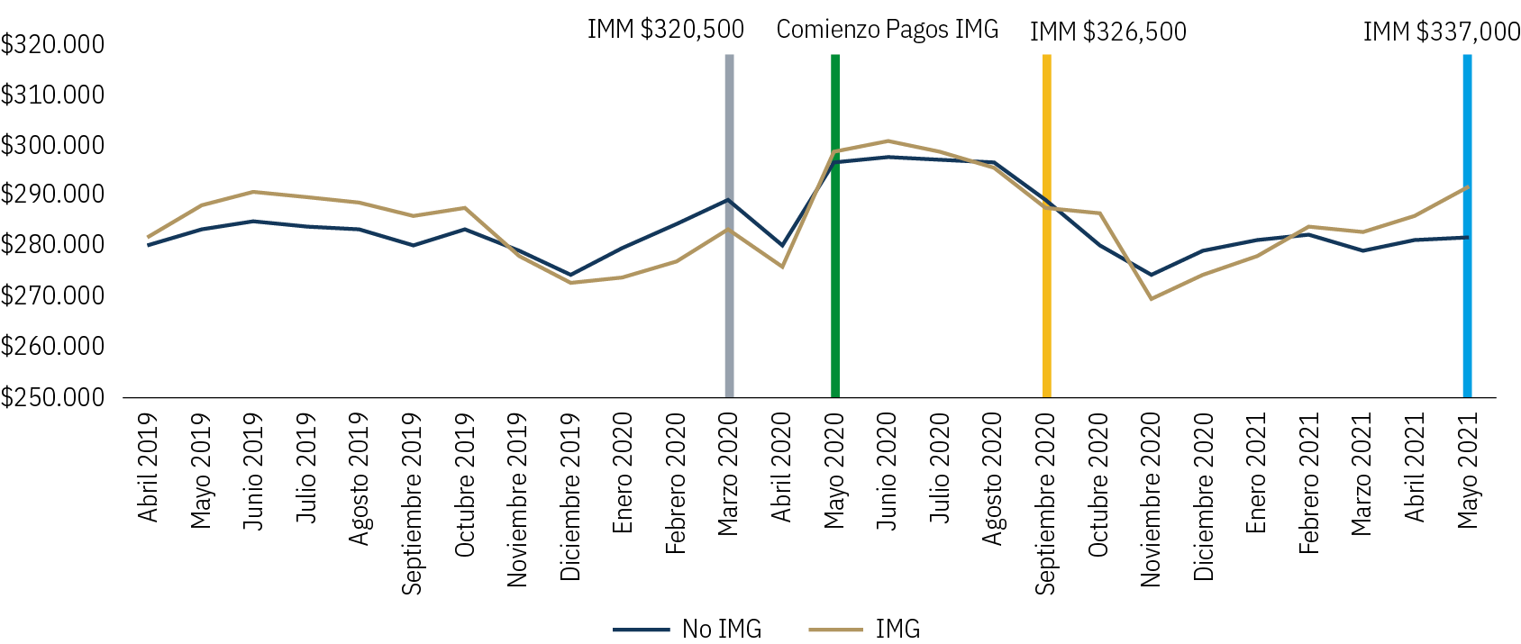 Notas: (a) La tabla presenta la evolución de la remuneración promedio que pagan las empresas a sus empleados que reciben $421.250 o menos según la clasificación: Empresa IMG y Empresa no IMG. Se considera que una empresa es IMG si, desde la entrada en vigencia de la Ley Nº 21.218, tuvo al menos a un trabajador acogido al beneficio. Por otra parte, se considera que una empresa no es IMG si ninguno de sus trabajadores ha recibido el subsidio desde la entrada en vigencia de la Ley N° 21.218. (b) Se identifican cuatro periodos relevantes: (1) en marzo de 2020 (línea gris) comienza a regir un nuevo ingreso mínimo mensual ($320.500 a partir del 1º de marzo de 2020 según el Decreto Nº 301 del Ministerio de Hacienda[82]) y además comienza la crisis sanitaria asociada al COVID-19. (2) En mayo de 2020 (línea verde) comienzan a entregarse los primeros pagos de IMG. (3) En septiembre de 2020 (línea amarilla) y (4) mayo de 2021 (línea azul) se efectúan los reajustes del ingreso mínimo (por montos equivalentes a $326.500 a partir del 1º de septiembre de 2020 y $337.000 a contar del 1º de mayo de 2021, respectivamente)[83].