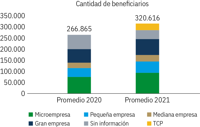 [80] Los beneficiarios potenciales se definen como los trabajadores afiliados al SC que pertenecen a un hogar del 90% más vulnerable según el RSH, que reciben una remuneración bruta mensual inferior a $384.363 hasta mayo de 2021 o inferior a $421.250 a partir de julio de 2021. La información disponible no permite verificar el cumplimiento del requisito de jornada (horas trabajadas).