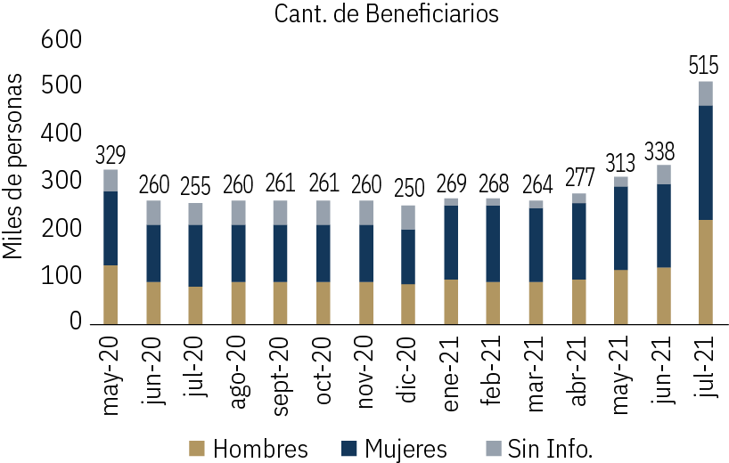 [78] Notar que el mes de julio no se presenta en la Tabla 5, debido a que no es posible identificar las cotizaciones correspondiente a este mes. Sin embargo, al saber que 798.292 personas en total han recibido al menos un pago por IMG (según lo dispuesto en la Tabla 4), es posible identificar cuántas personas ingresaron al beneficio en julio.