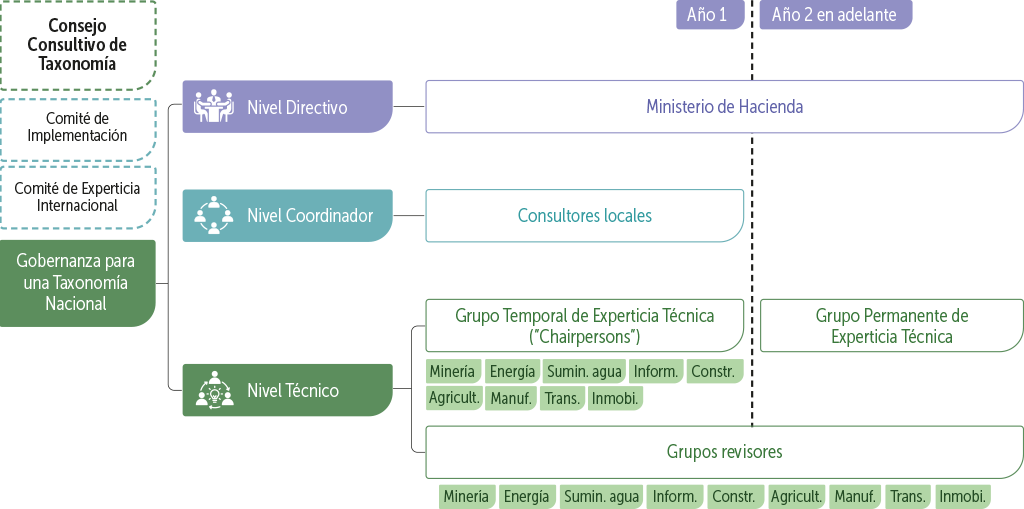 En este contexto, la Taxonomía de Chile se desarrollará bajo una gobernanza que contará con tres niveles: