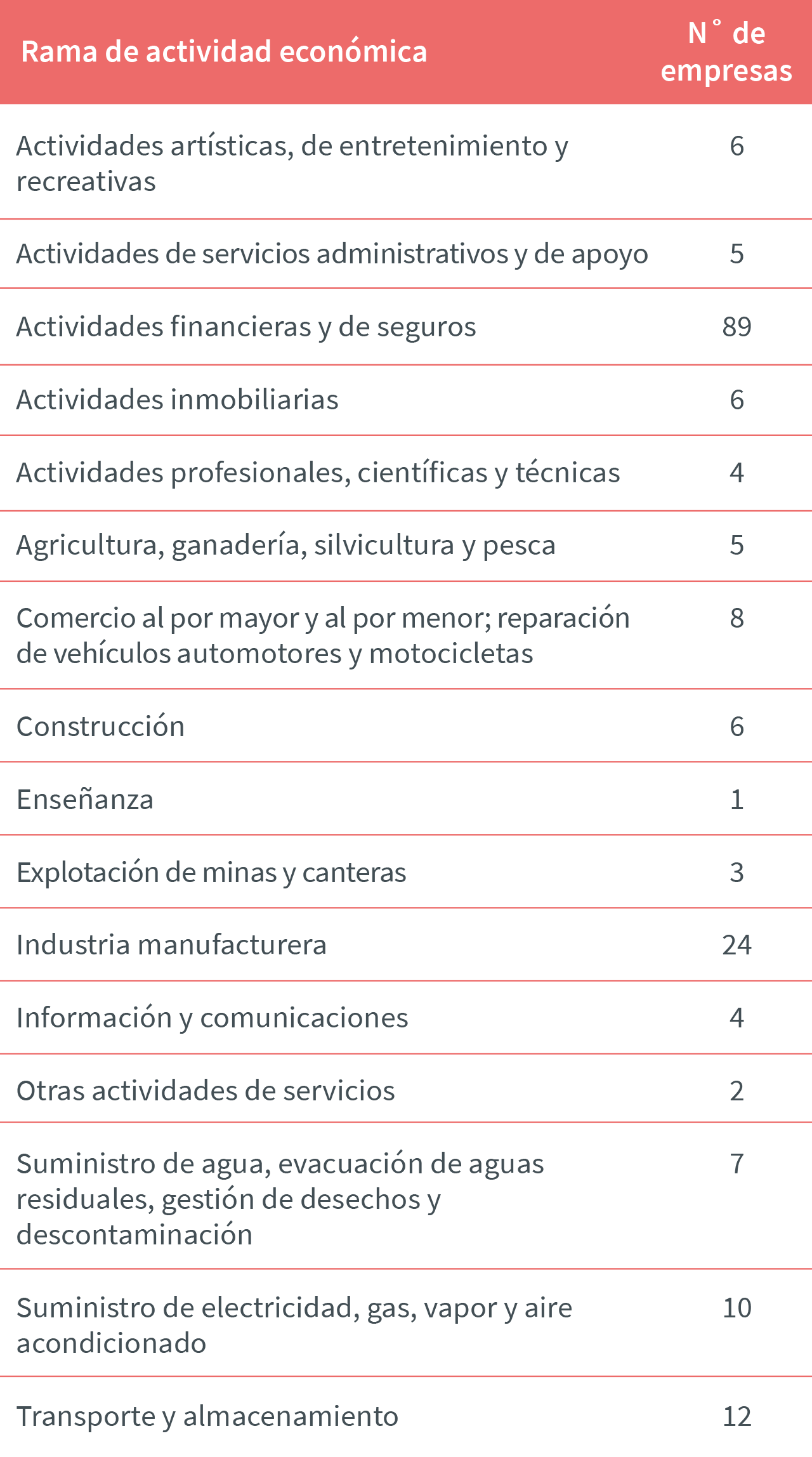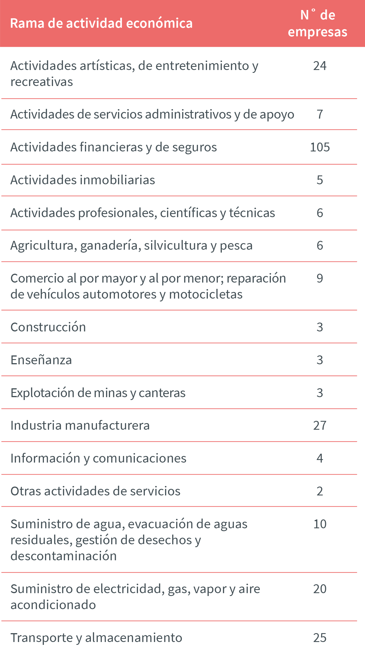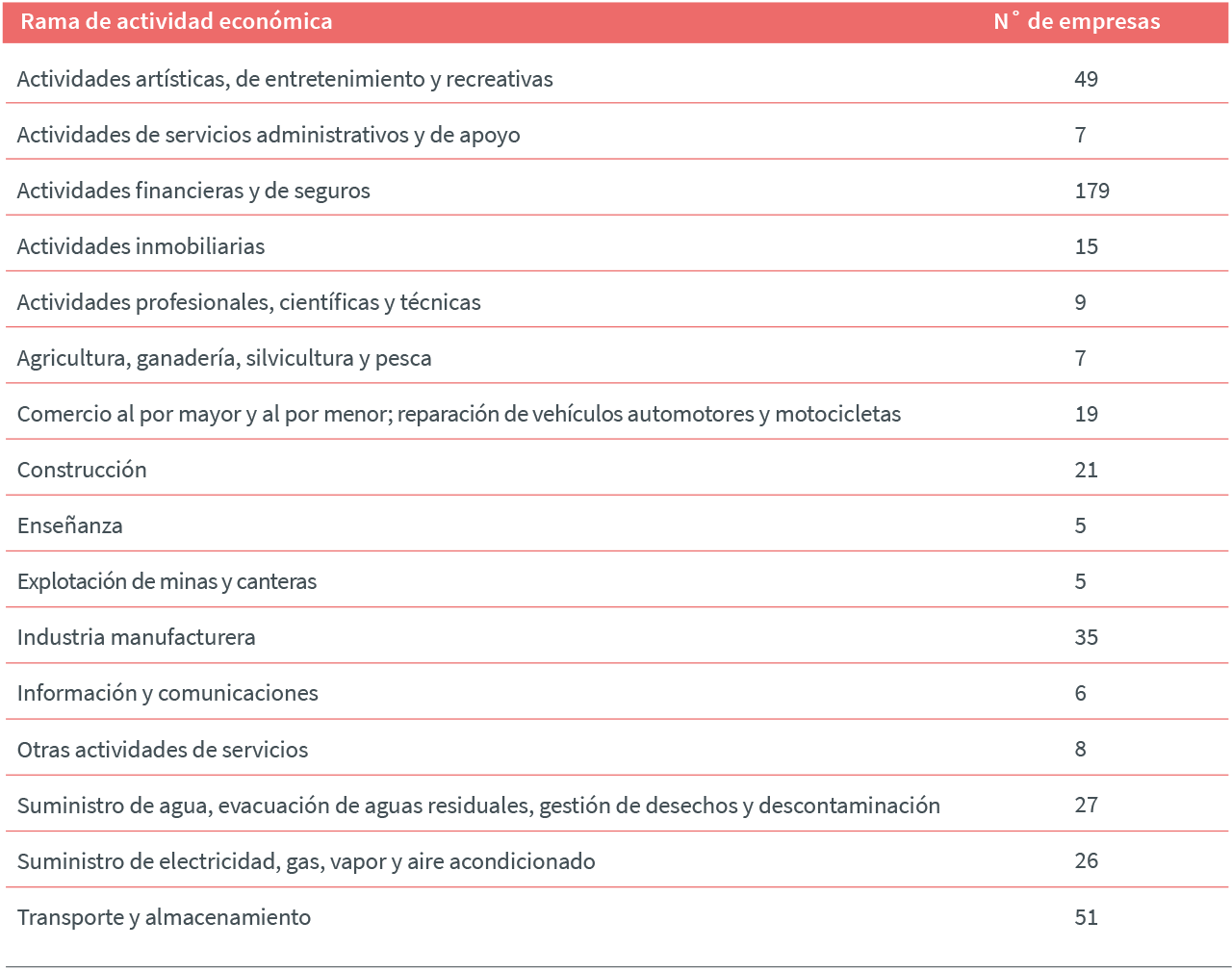 Para clasificar a las organizaciones por industria, se utilizó como referencia la clasificación por rubro que el Servicio de Impuestos Internos (SII) registra para las organizaciones analizadas. A partir del año comercial 2018, el rubro económico se determina como la actividad vigente ante el SII, durante el año correspondiente, para aquellos contribuyentes que registren una única actividad económica. En caso de poseer múltiples actividades, se determina como la principal aquella declarada en la consulta de actividad económica principal.