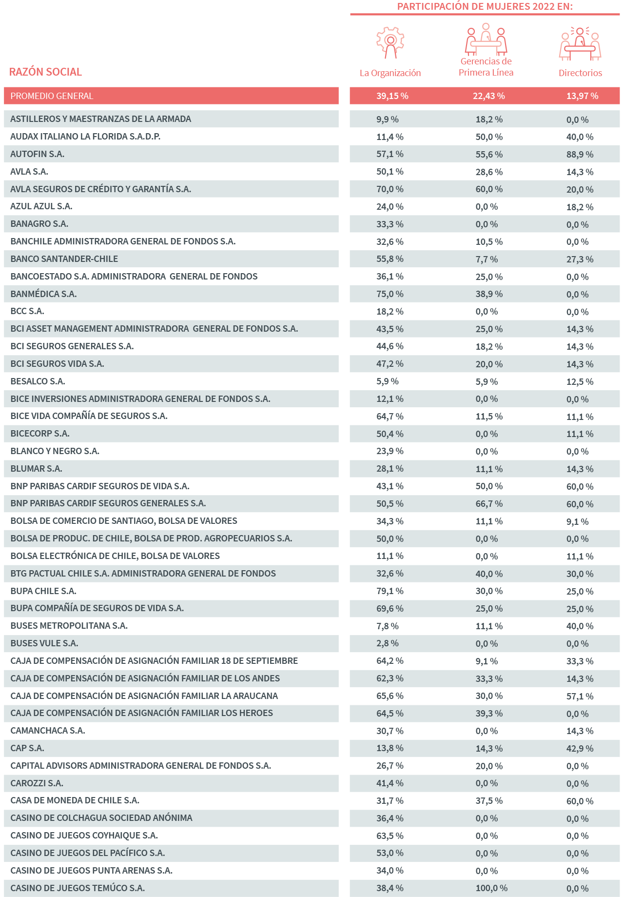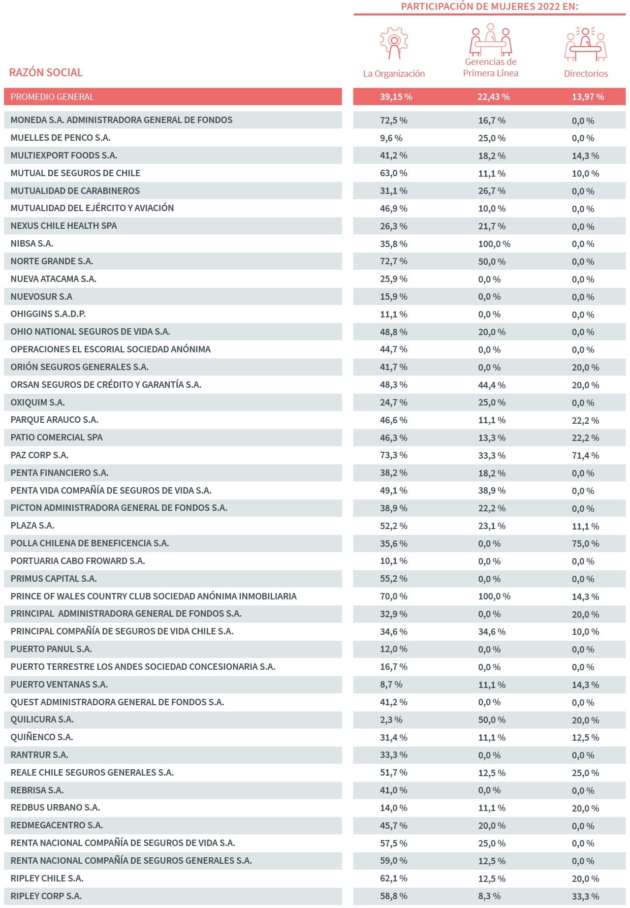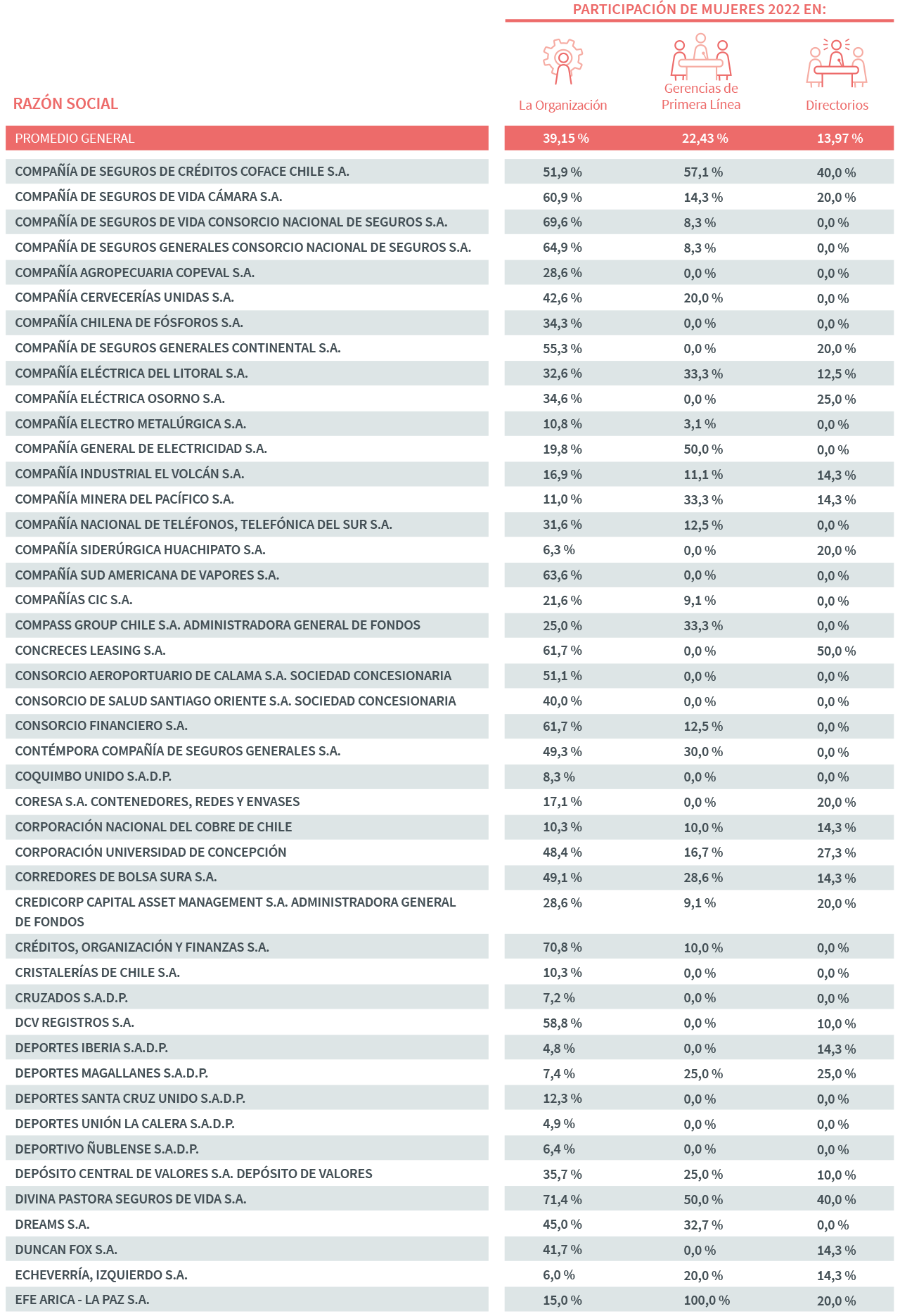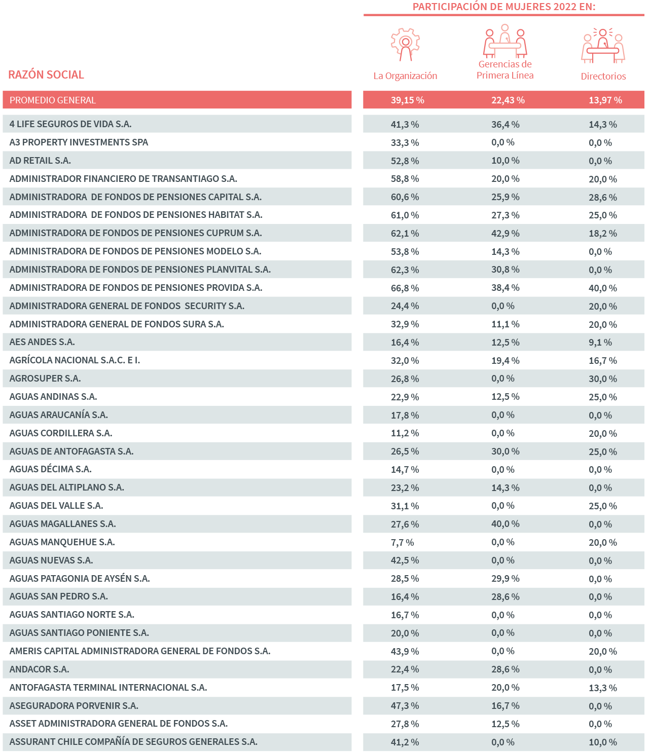 La Norma de Carácter General N° 386 especifica que se debe reportar el número de hombres y mujeres en distintos niveles jerárquicos de la organización. Con esta información se construyen los porcentajes de participación de mujeres en dichos niveles. Esta se calcula como el número de mujeres en cada rango respecto al total de personas en el mismo. Los tres niveles son nivel directivo, gerencia de primera línea y trabajadoras/ es de cargos más bajos.