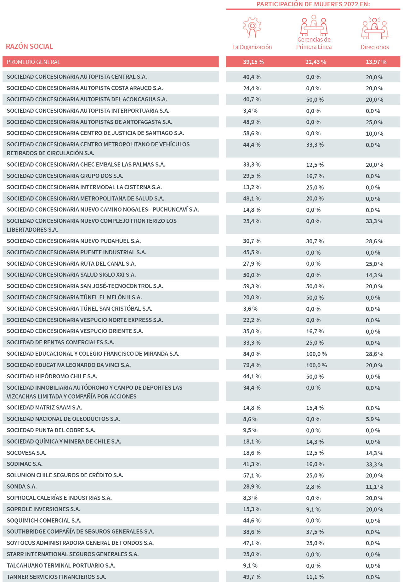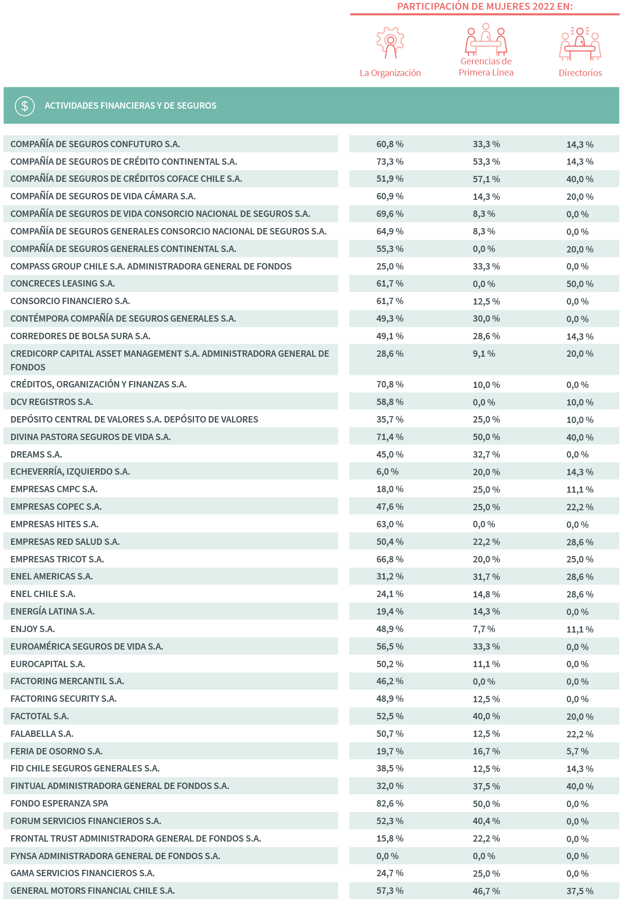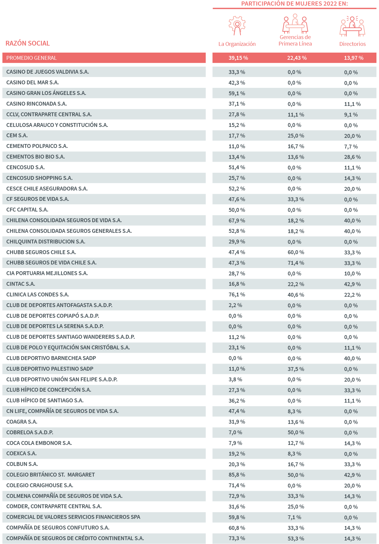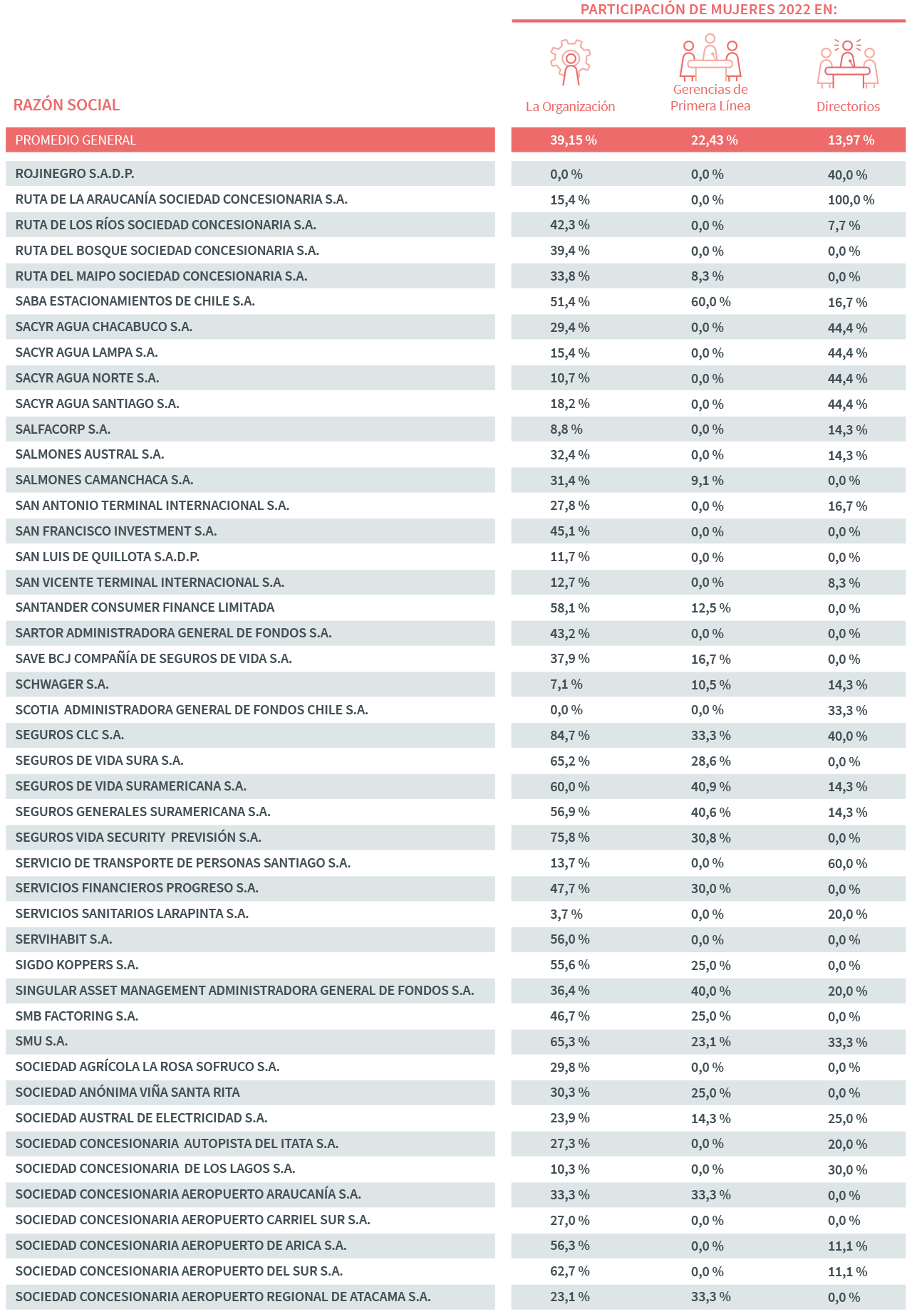 La Norma de Carácter General N° 386 especifica que se debe reportar el número de hombres y mujeres en distintos niveles jerárquicos de la organización. Con esta información se construyen los porcentajes de participación de mujeres en dichos niveles. Esta se calcula como el número de mujeres en cada rango respecto al total de personas en el mismo. Los tres niveles son nivel directivo, gerencia de primera línea y trabajadoras/ es de cargos más bajos.