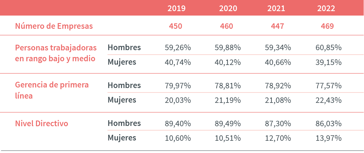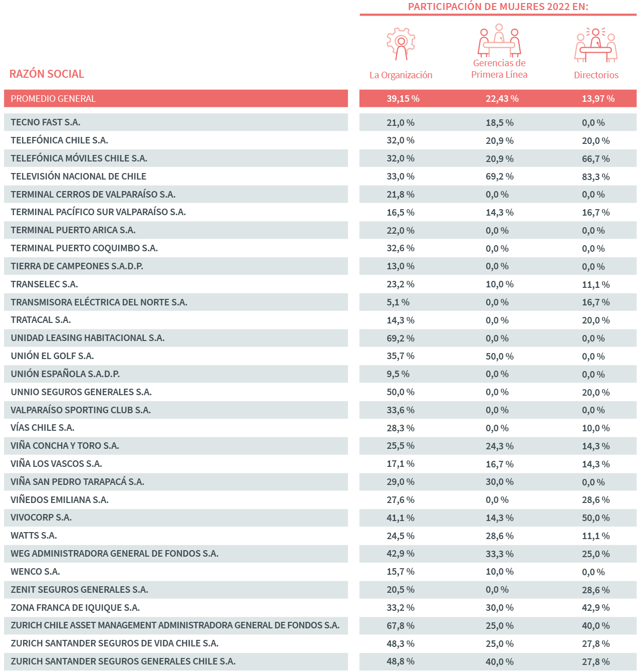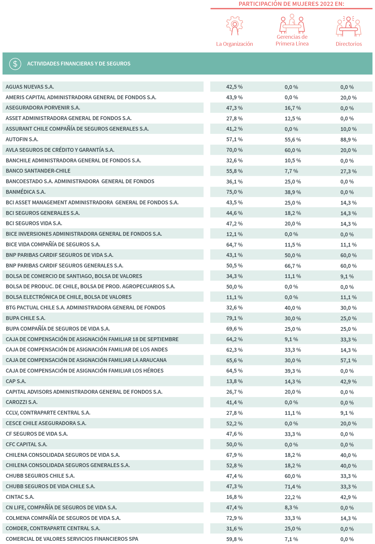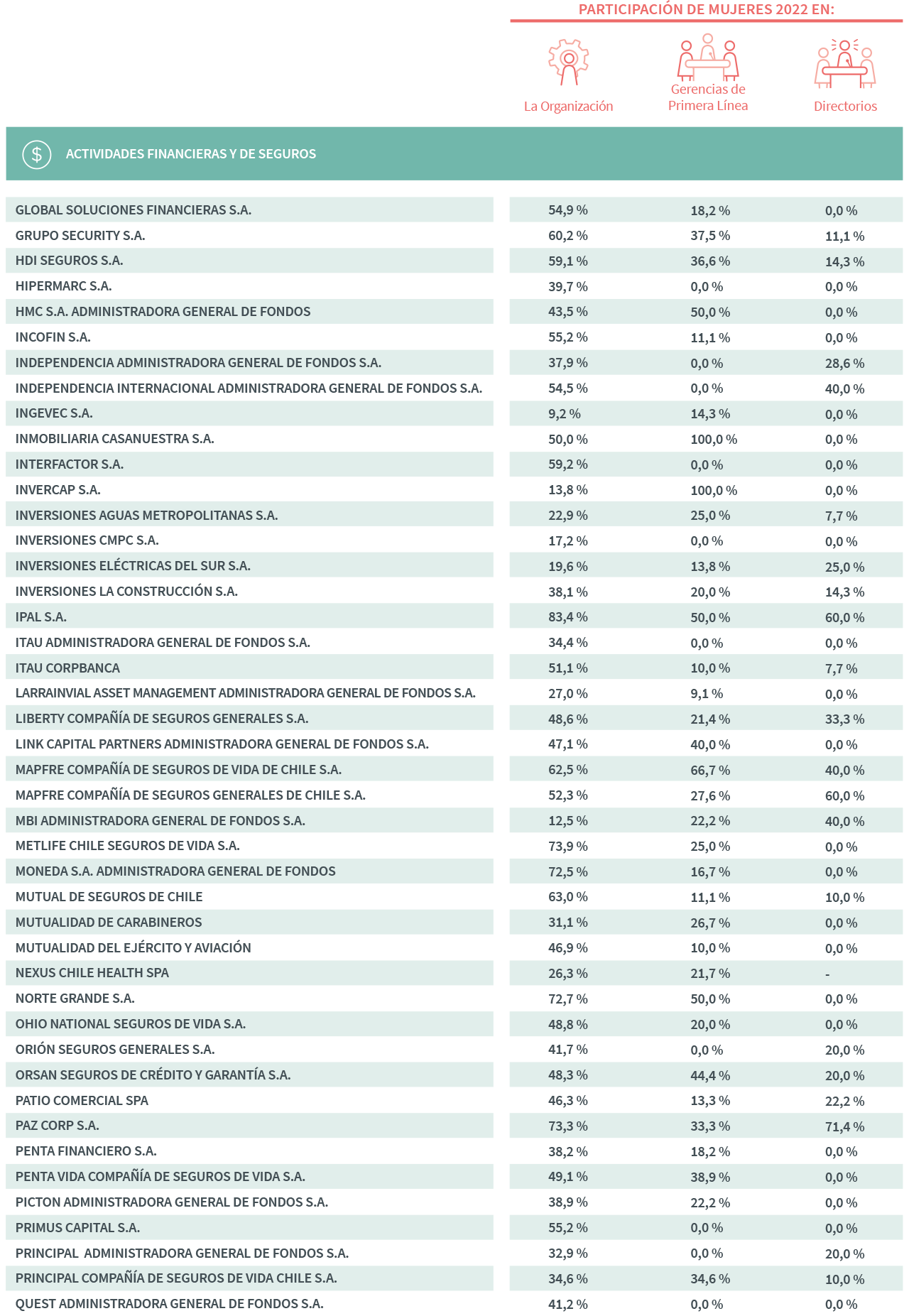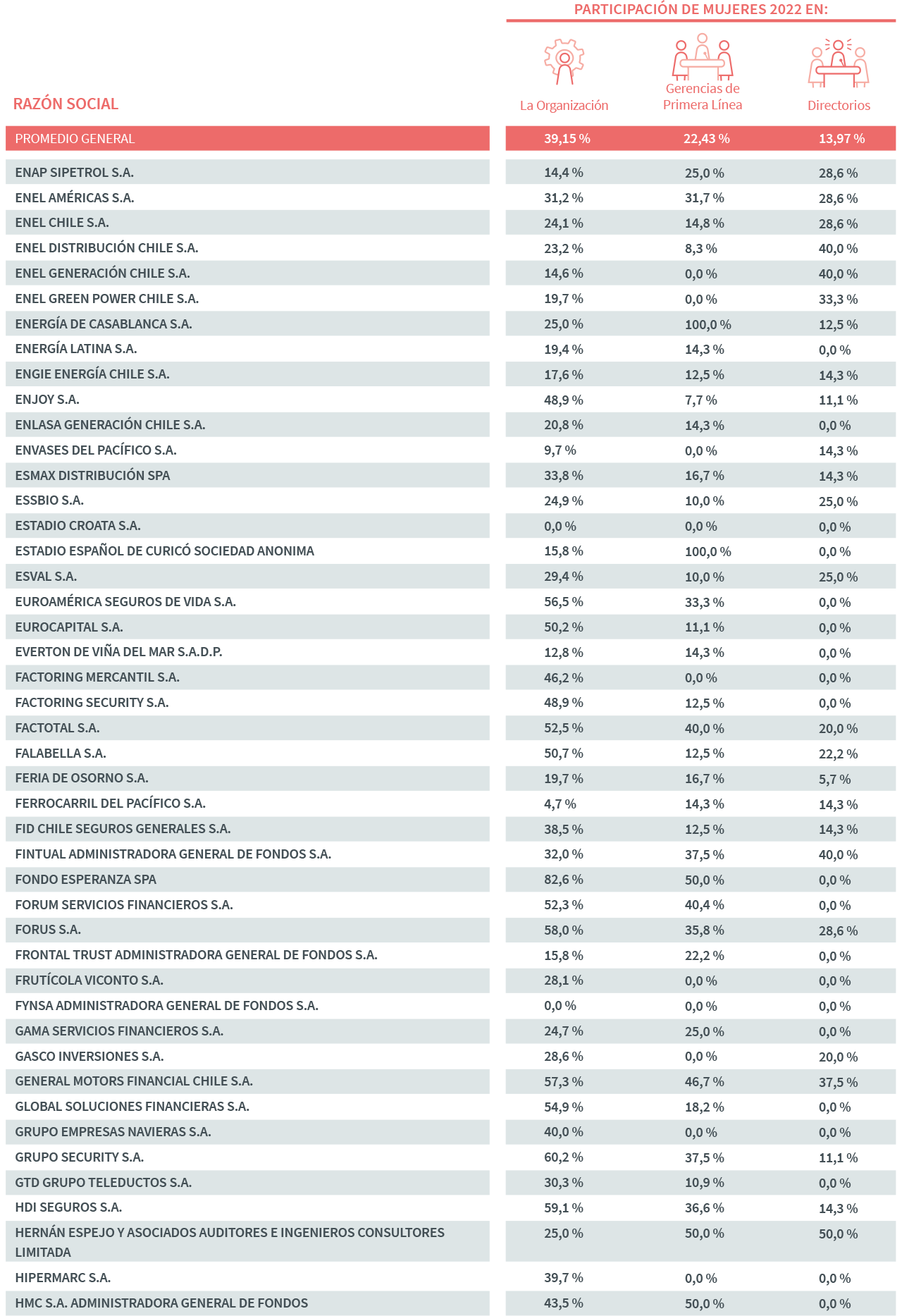 La Norma de Carácter General N° 386 especifica que se debe reportar el número de hombres y mujeres en distintos niveles jerárquicos de la organización. Con esta información se construyen los porcentajes de participación de mujeres en dichos niveles. Esta se calcula como el número de mujeres en cada rango respecto al total de personas en el mismo. Los tres niveles son nivel directivo, gerencia de primera línea y trabajadoras/ es de cargos más bajos.