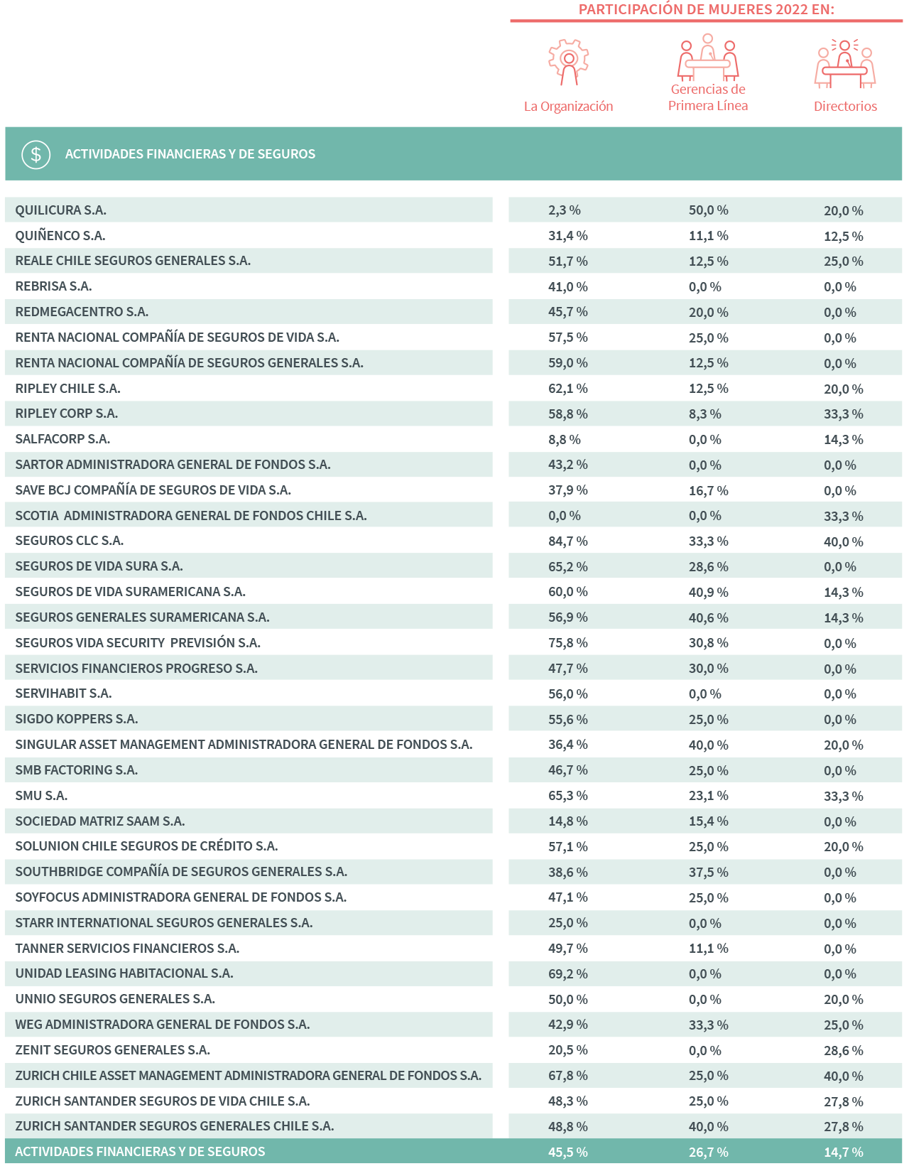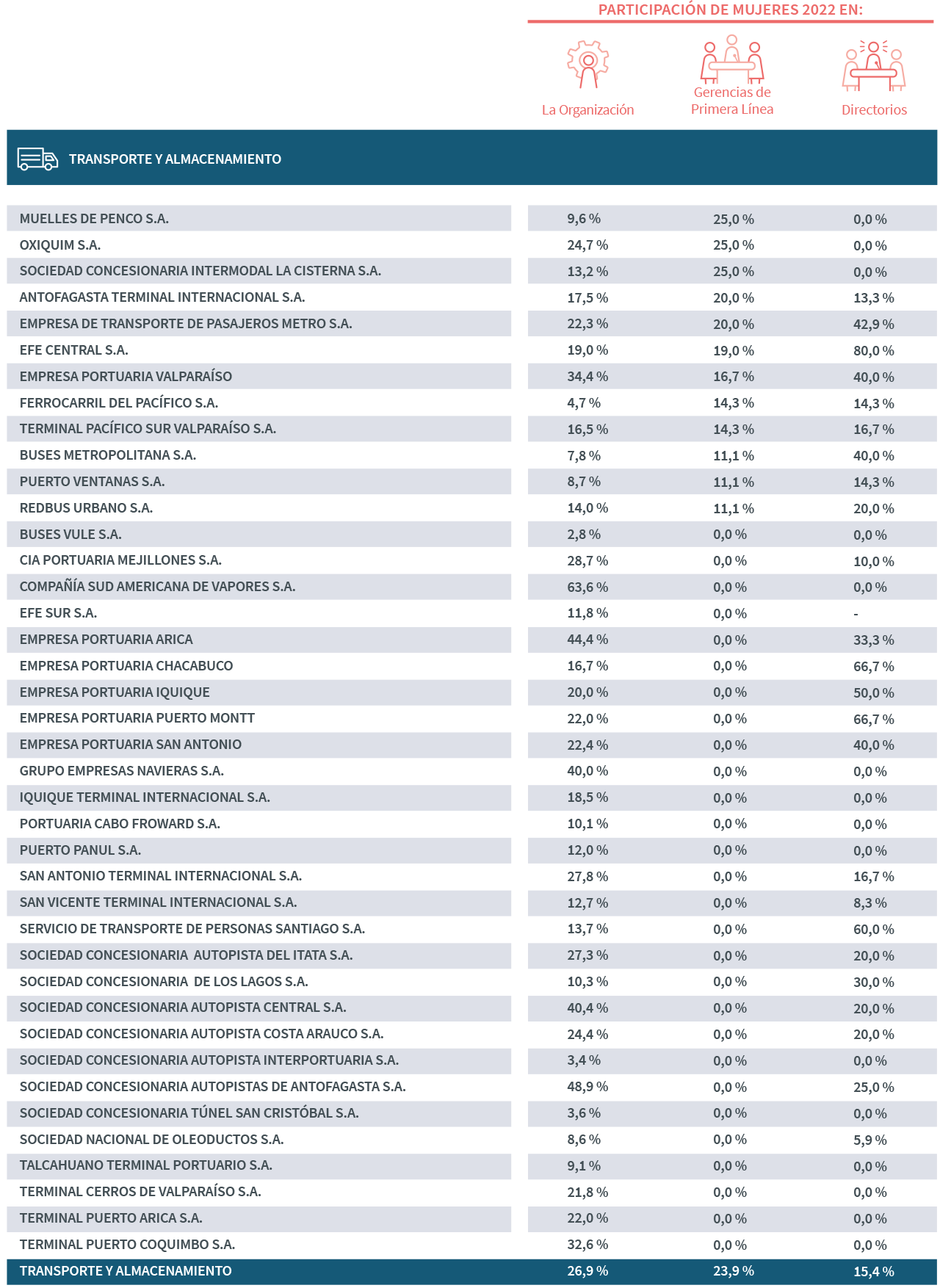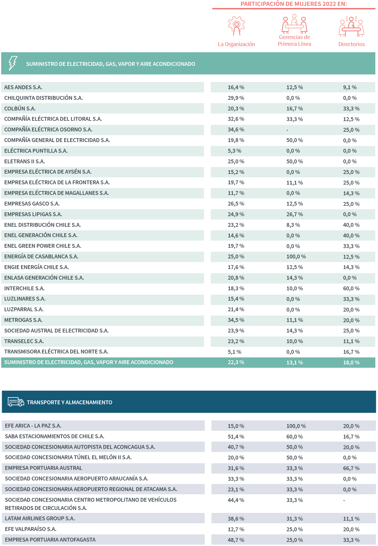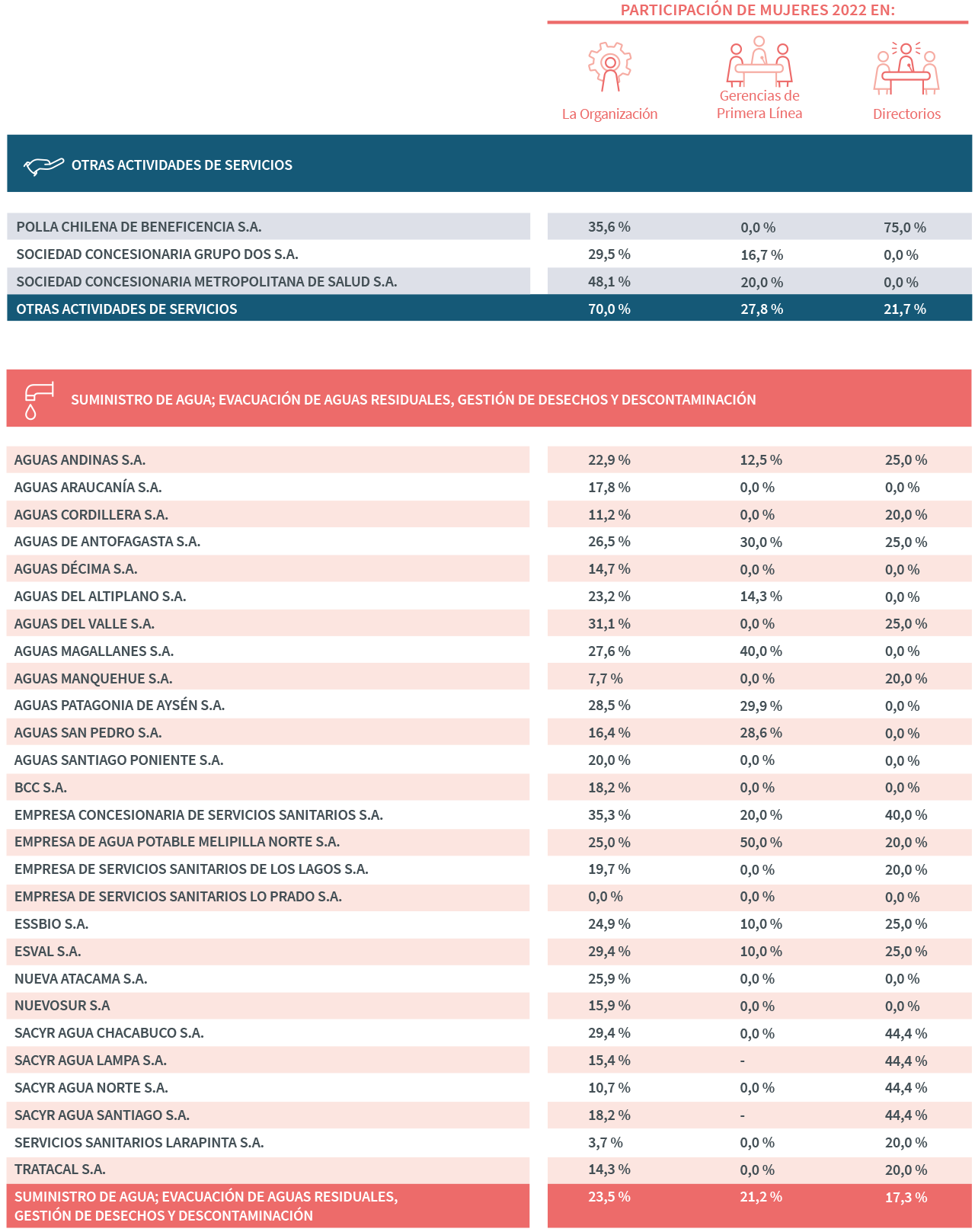 La Norma de Carácter General N° 386 especifica que se debe reportar el número de hombres y mujeres en distintos niveles jerárquicos de la organización. Con esta información se construyen los porcentajes de participación de mujeres en dichos niveles. Esta se calcula como el número de mujeres en cada rango respecto al total de personas en el mismo. Los tres niveles son nivel directivo, gerencia de primera línea y trabajadoras/ es de cargos más bajos.