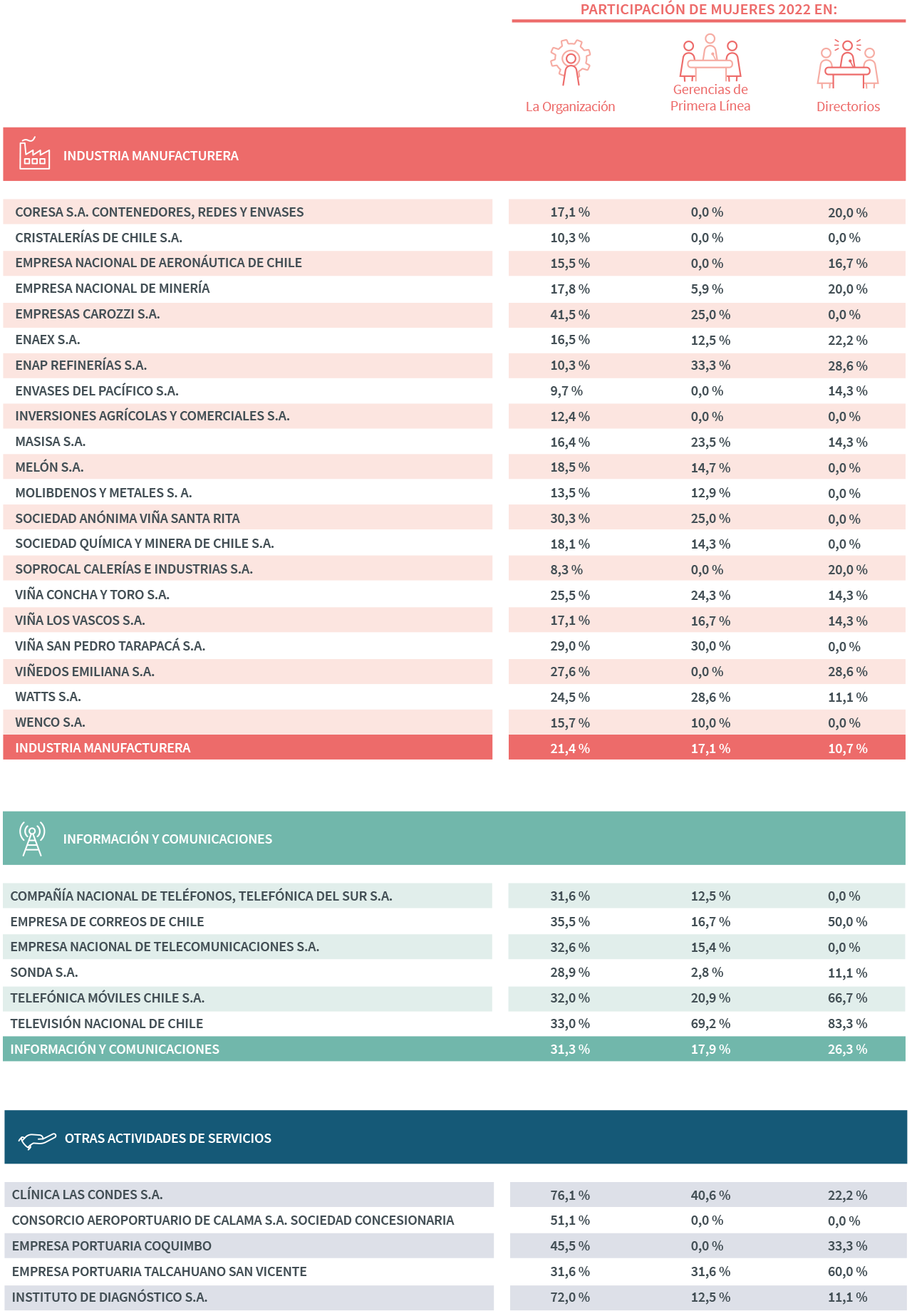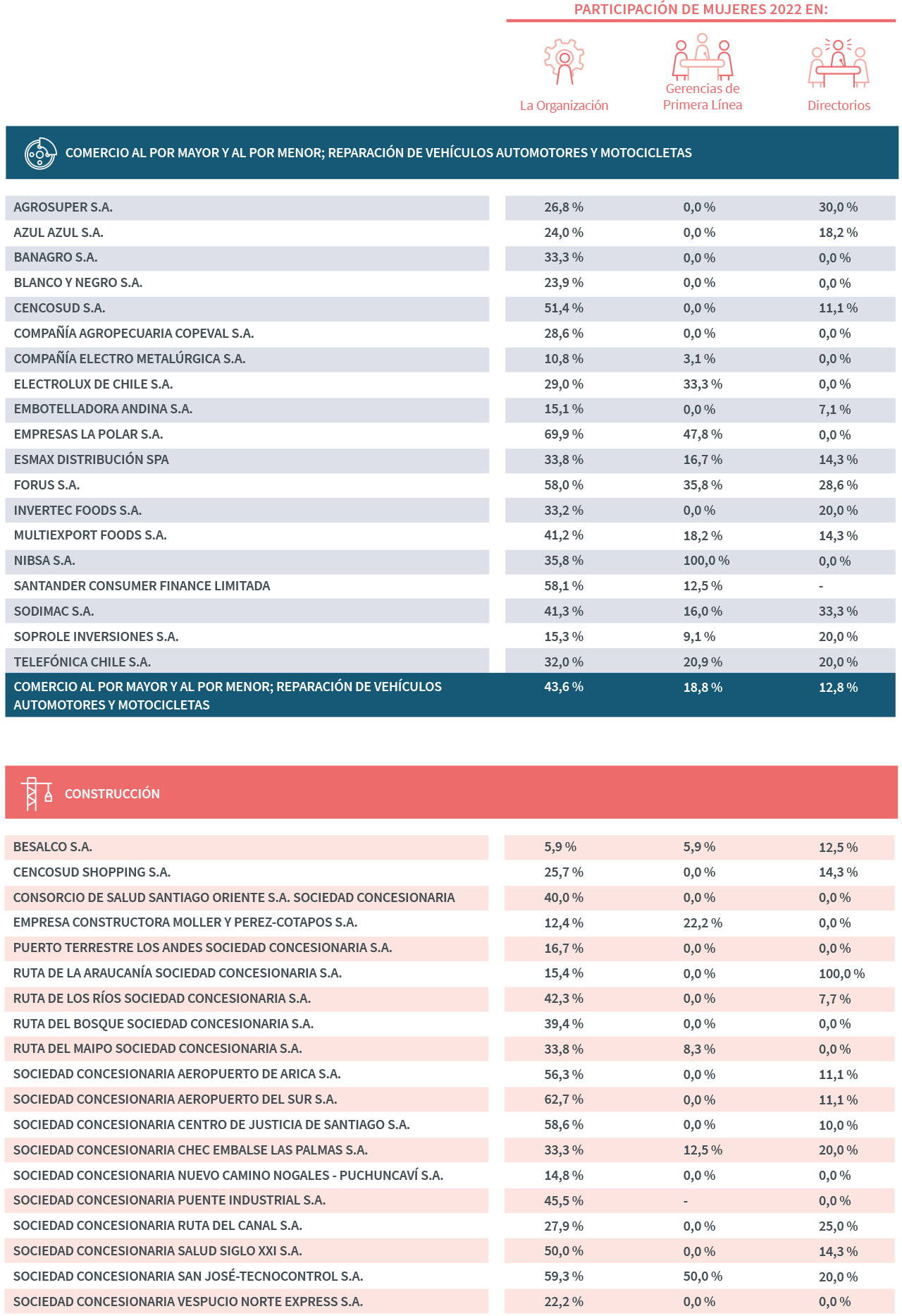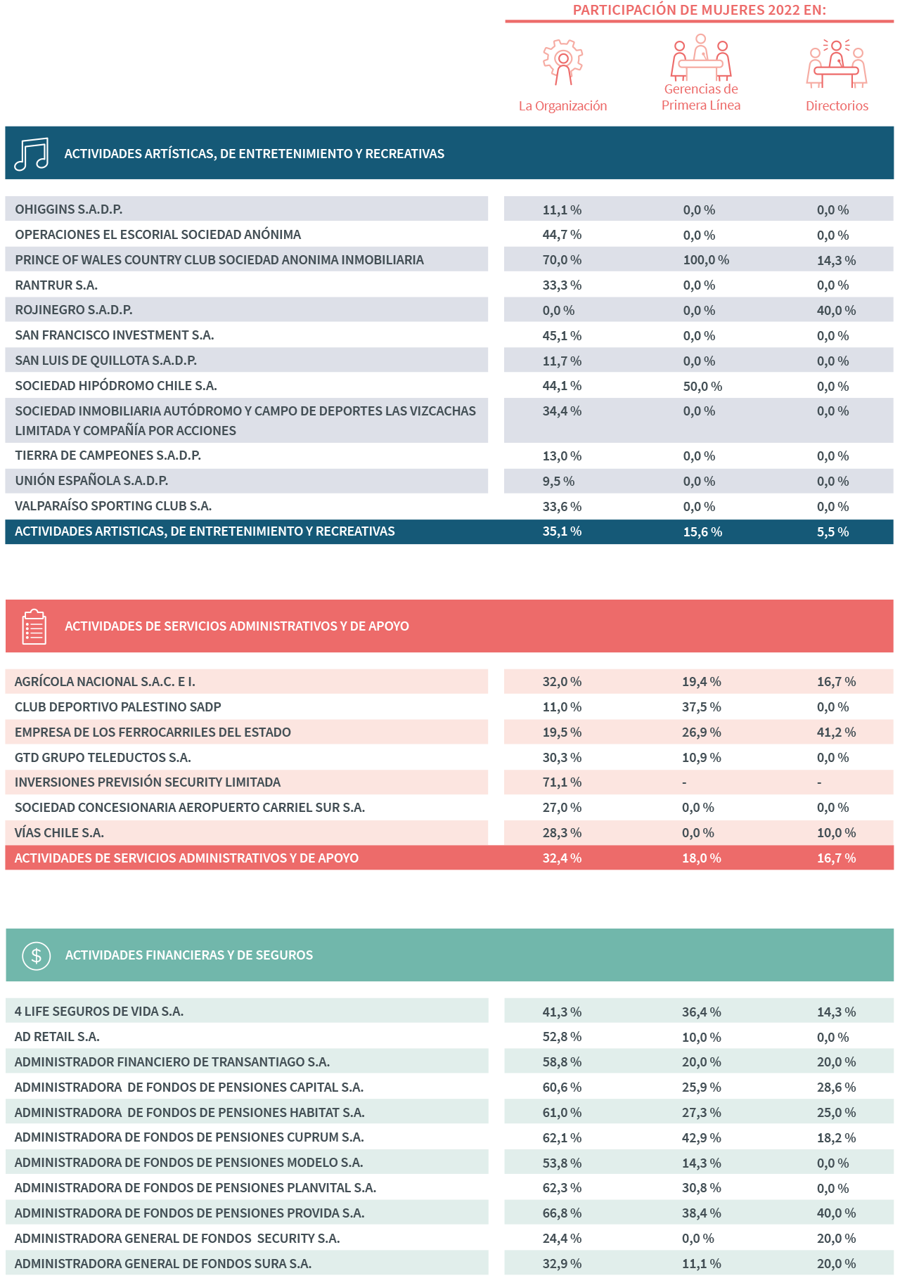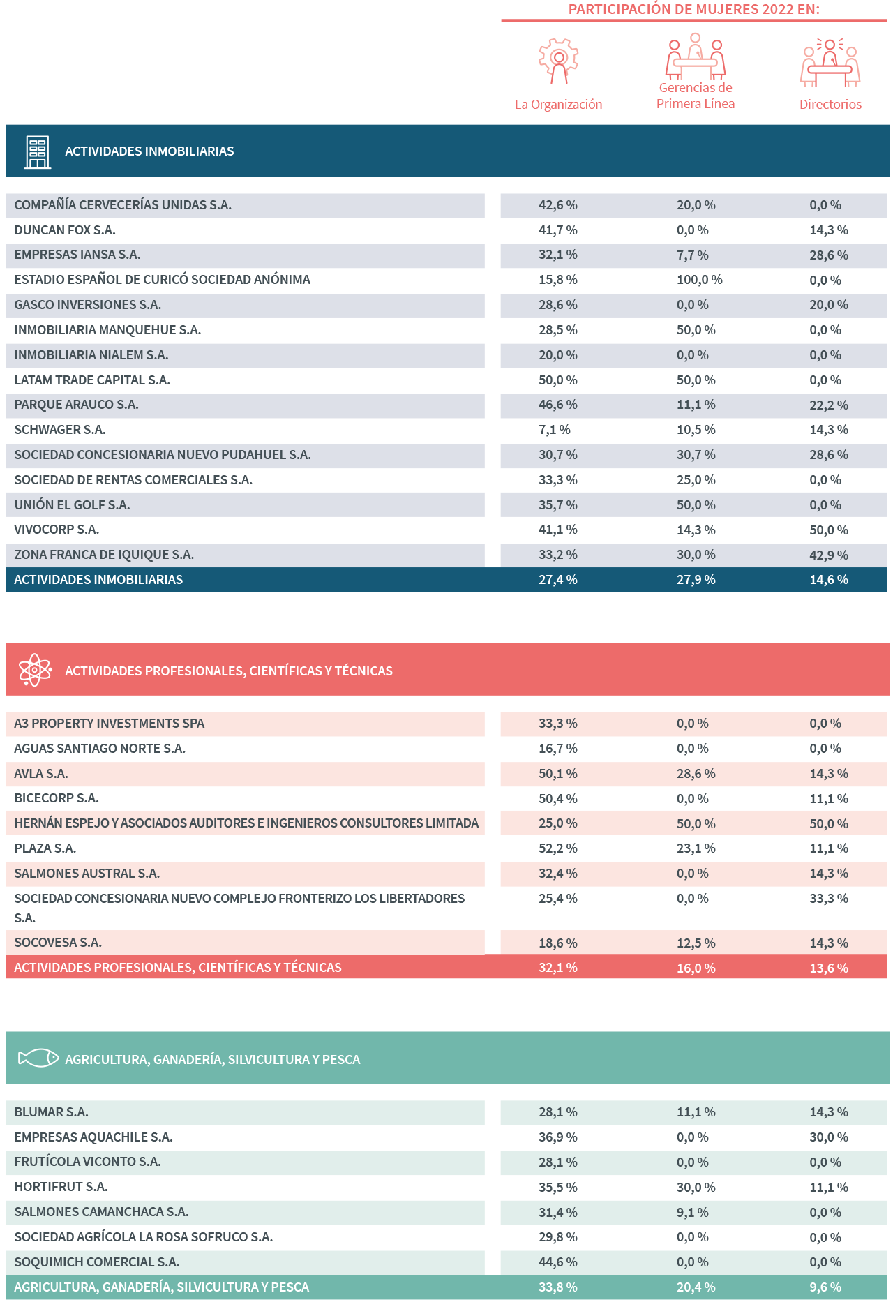 La diferencia más importante de estos Cuadros respecto a los Cuadros 2, 3 y 4 presentados en el informe se da en el caso de las Actividades de servicios administrativos y de apoyo. Entre 2020 y 2021 hubo empresas que cambiaron de esa rama a otras, lo que genera cambios bruscos para los tres indicadores de participación. El dejar sólo empresas que no hayan cambiado el rubro genera un enorme aumento de la tasa de participación de trabajadoras para dicha actividad económica a cifras en torno al 70% y reduce la participación en los otros niveles a un 0%. La metodología usada en esa parte del informe permite apreciar mejor las variaciones de la participación de mujeres en las empresas perteneciente a cada rubro en el periodo, pero distorsiona la magnitud en torno a la cual se dan esas variaciones. Sin embargo, este último aspecto se analiza mejor en el ítem que muestra las estadísticas para el total de empresas que reportan datos en 2022.
