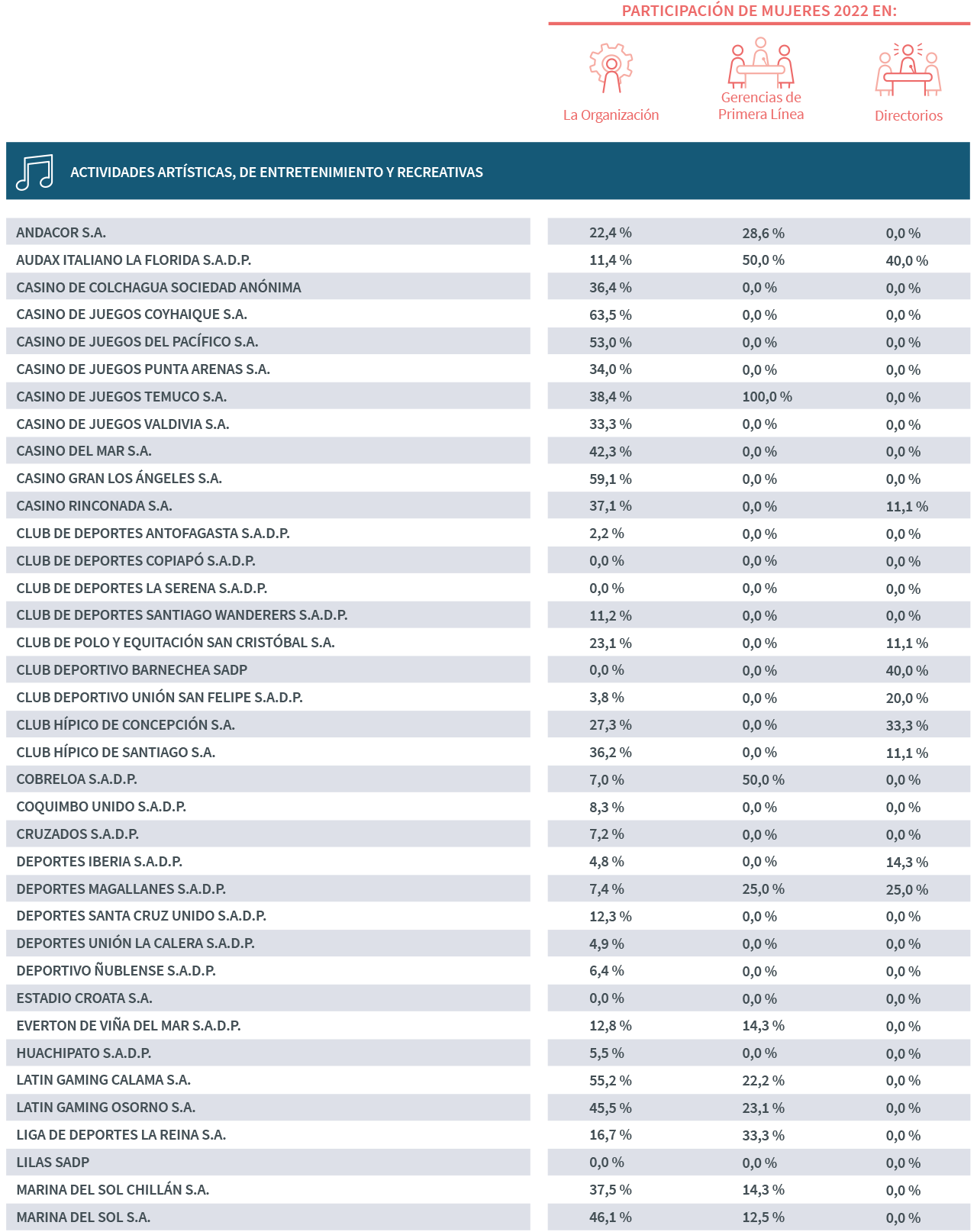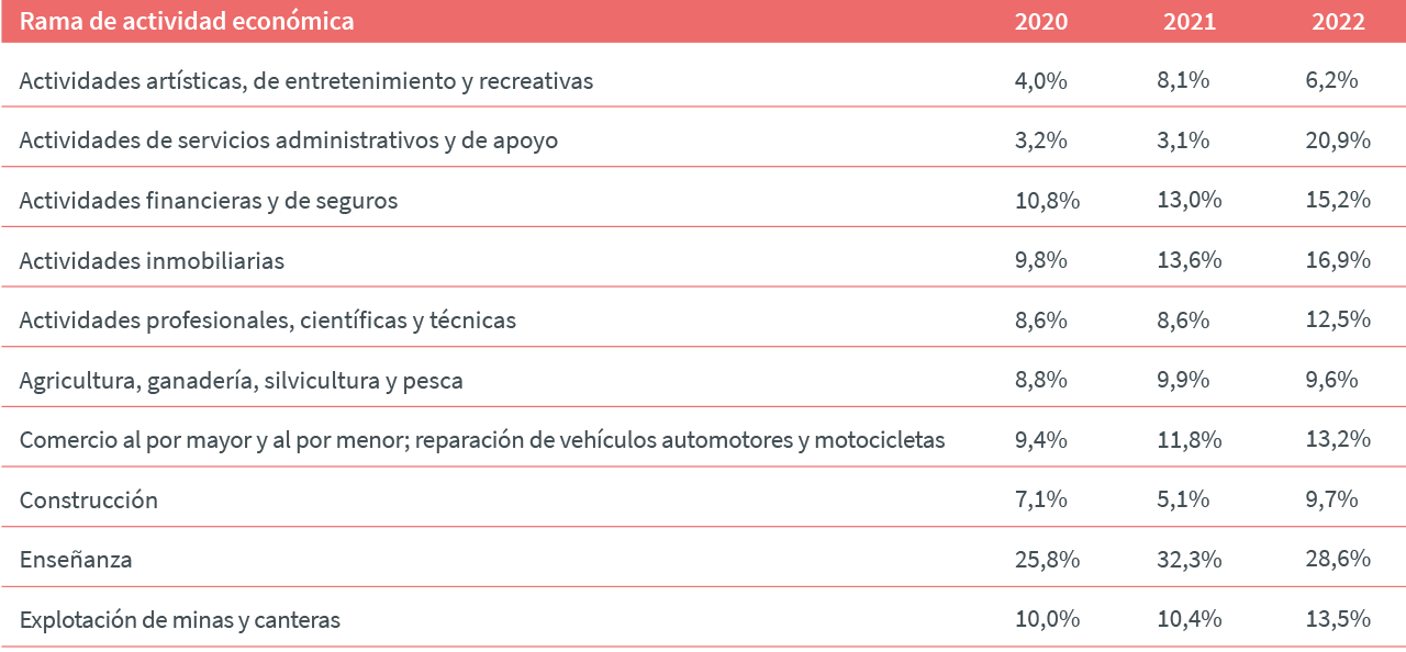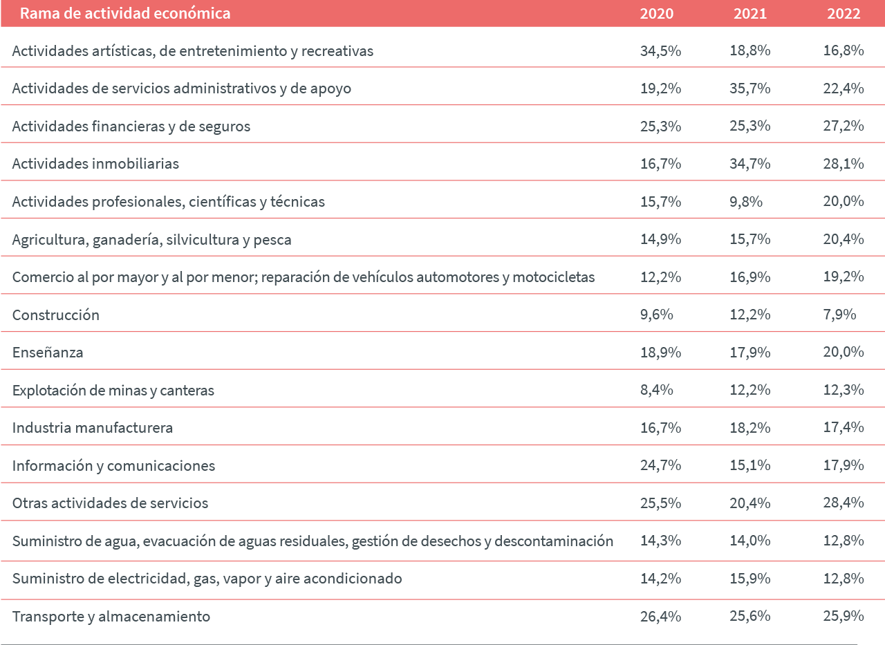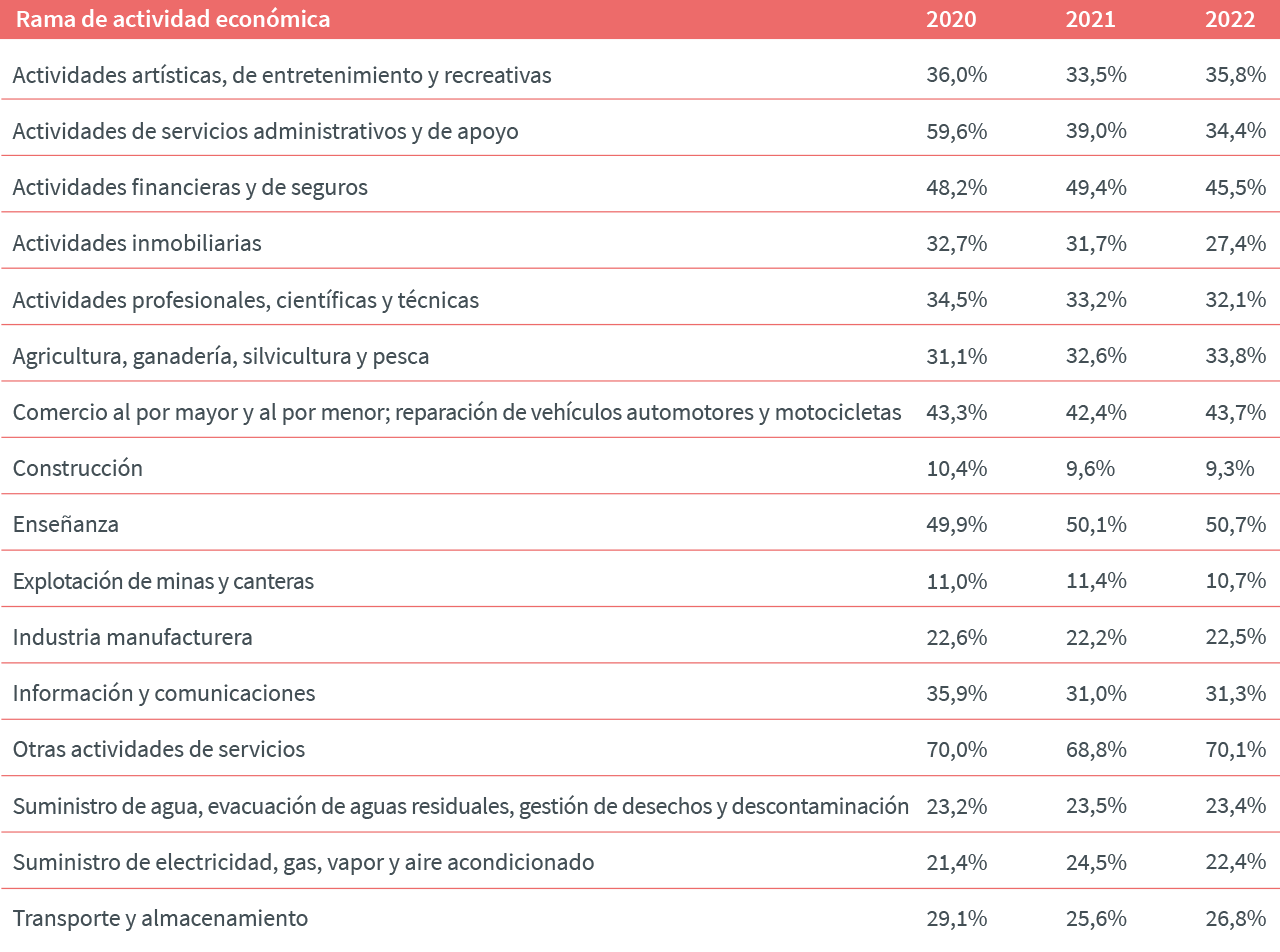 La diferencia más importante de estos Cuadros respecto a los Cuadros 2, 3 y 4 presentados en el informe se da en el caso de las Actividades de servicios administrativos y de apoyo. Entre 2020 y 2021 hubo empresas que cambiaron de esa rama a otras, lo que genera cambios bruscos para los tres indicadores de participación. El dejar sólo empresas que no hayan cambiado el rubro genera un enorme aumento de la tasa de participación de trabajadoras para dicha actividad económica a cifras en torno al 70% y reduce la participación en los otros niveles a un 0%. La metodología usada en esa parte del informe permite apreciar mejor las variaciones de la participación de mujeres en las empresas perteneciente a cada rubro en el periodo, pero distorsiona la magnitud en torno a la cual se dan esas variaciones. Sin embargo, este último aspecto se analiza mejor en el ítem que muestra las estadísticas para el total de empresas que reportan datos en 2022.
