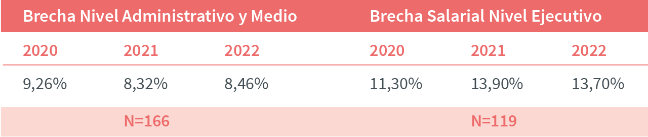Para el caso específico de Brechas Salariales no se consideró el año 2019, pues las brechas estaban reportadas de forma distinta a años posteriores (contemplaba tres niveles). Por otro lado, no todas las empresas reportaron datos para este ítem y muchas entregaron sólo para uno de los niveles jerárquicos. Por lo anterior, en esa parte del análisis se consideraron muestras distintas para cada nivel jerárquico. De esta forma, la exposición de brecha salarial de nivel administrativo y medio considera los resultados de las 166 empresas que la reportaron para todo el periodo 2020-2022, mientras que, para el nivel ejecutivo, estas representaron 119 observaciones. Para ambos casos se calculó mediante un promedio simple de las brechas a nivel de empresa.