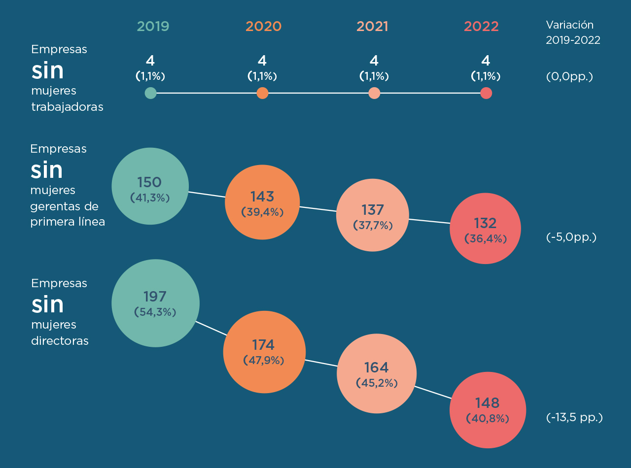 Las empresas sin mujeres contratadas, se han mantenido parejas, en un número de 4 cada año. Se observa una caída leve pero sostenida de las empresas sin mujeres en gerencias de primera línea, pasando de 150 el primer año a 132 en 2022. En el caso de las empresas con cero directoras, la caída es más pronunciada, de 197 a 148 empresas, con una variación del13,5%. (véase gráfico 3).