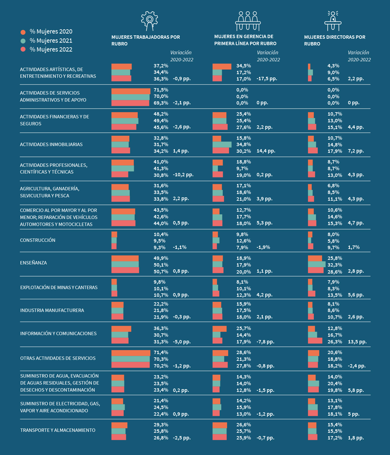 En el caso de las gerentas de primera línea, el rubro que muestra una mayor caída en cuanto a presencia de mujeres en esta categoría es el de Actividades artísticas, de entretenimiento y recreativas, que baja en casi 18 pp.; seguido por el sector de Información y comunicaciones. Resulta interesante el aumento en este nivel de 4,2 pp. en la Explotación de minas y canteras, considerando las estadísticas de participación de mujeres en otras categorías. También se incrementan las mujeres en gerencias de primera línea de forma importante en las industrias de Actividades inmobiliarias (14,4 pp.); Agricultura, ganadería, silvicultura y pesca (4 pp.) y Comercio al por mayor y al por menor, reparación de vehículos automotores y motocicletas (5,3 pp.). Por último, el caso de Actividades de servicios administrativos y de apoyo levanta una alerta, ya que pese a tener una de las tasas más altas de participación laboral femenina, no cuenta con gerentas de primera línea.