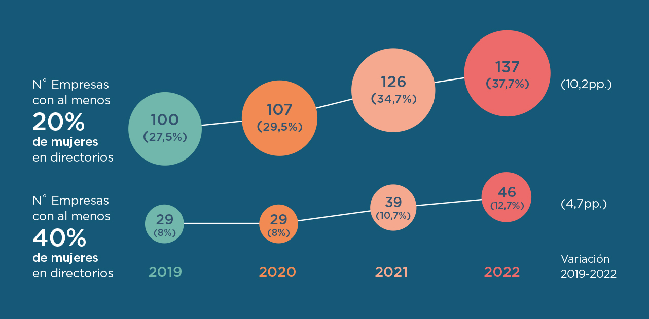 Considerando este contexto, es interesante observar que el número de empresas con al menos 20% de mujeres en el directorio ha aumentado sostenidamente entre 2019 y 2022, pasando de 100 a 137 en cuatro años, alcanzando el 37,7% de las empresas analizadas (variación de 10,2 pp.). Por otra parte, a pesar de que el porcentaje de empresas con al menos 40% de mujeres en directorios se ha expandido en el tiempo (variación de 4,7 pp. entre 2019 y 2022), se sigue observando un crecimiento más lento y en menor magnitud que en el primer grupo. Al año 2022, todavía son menos de 50 organizaciones y representan sólo el 12,7% del total de firmas estudiadas.