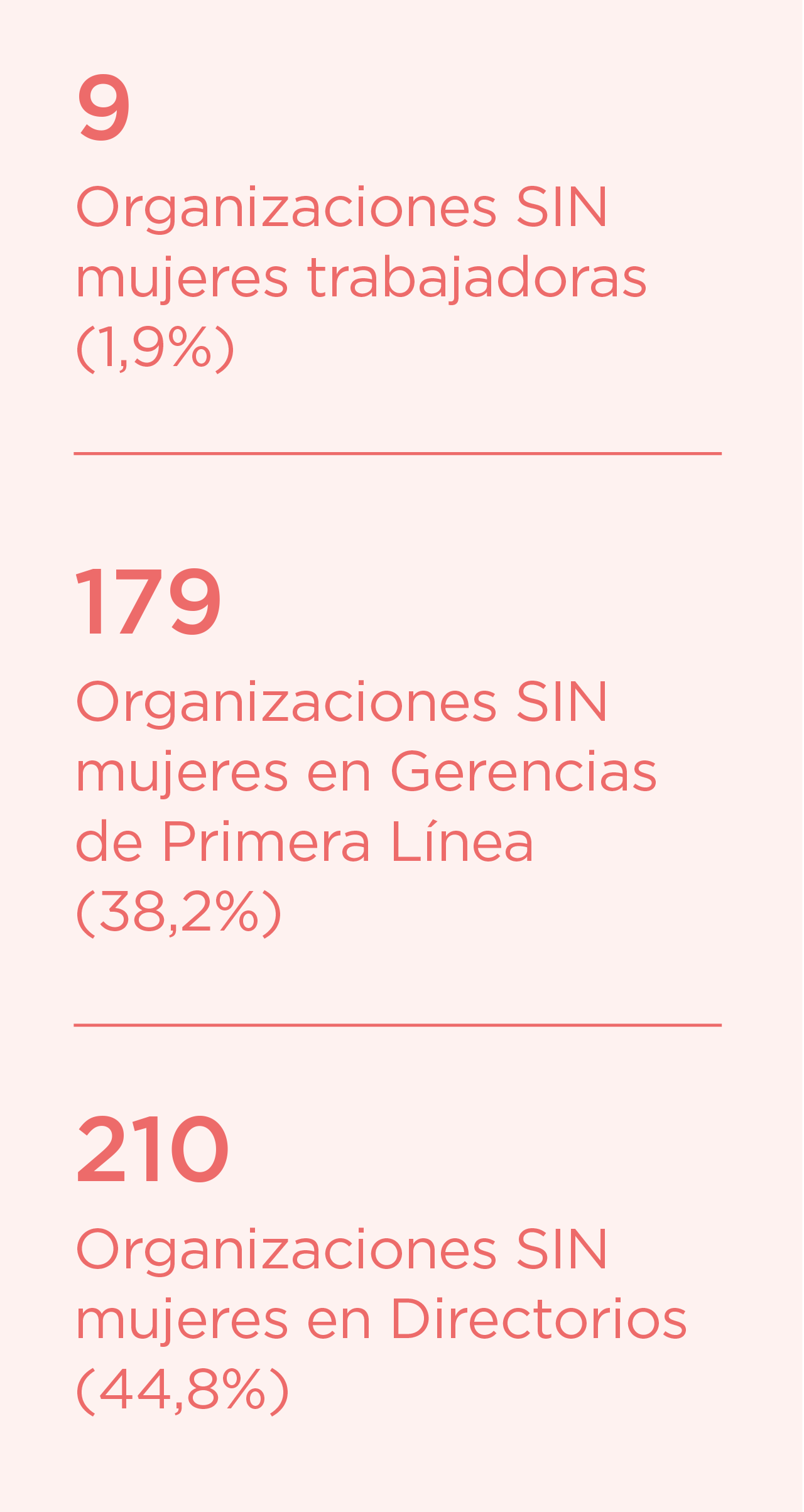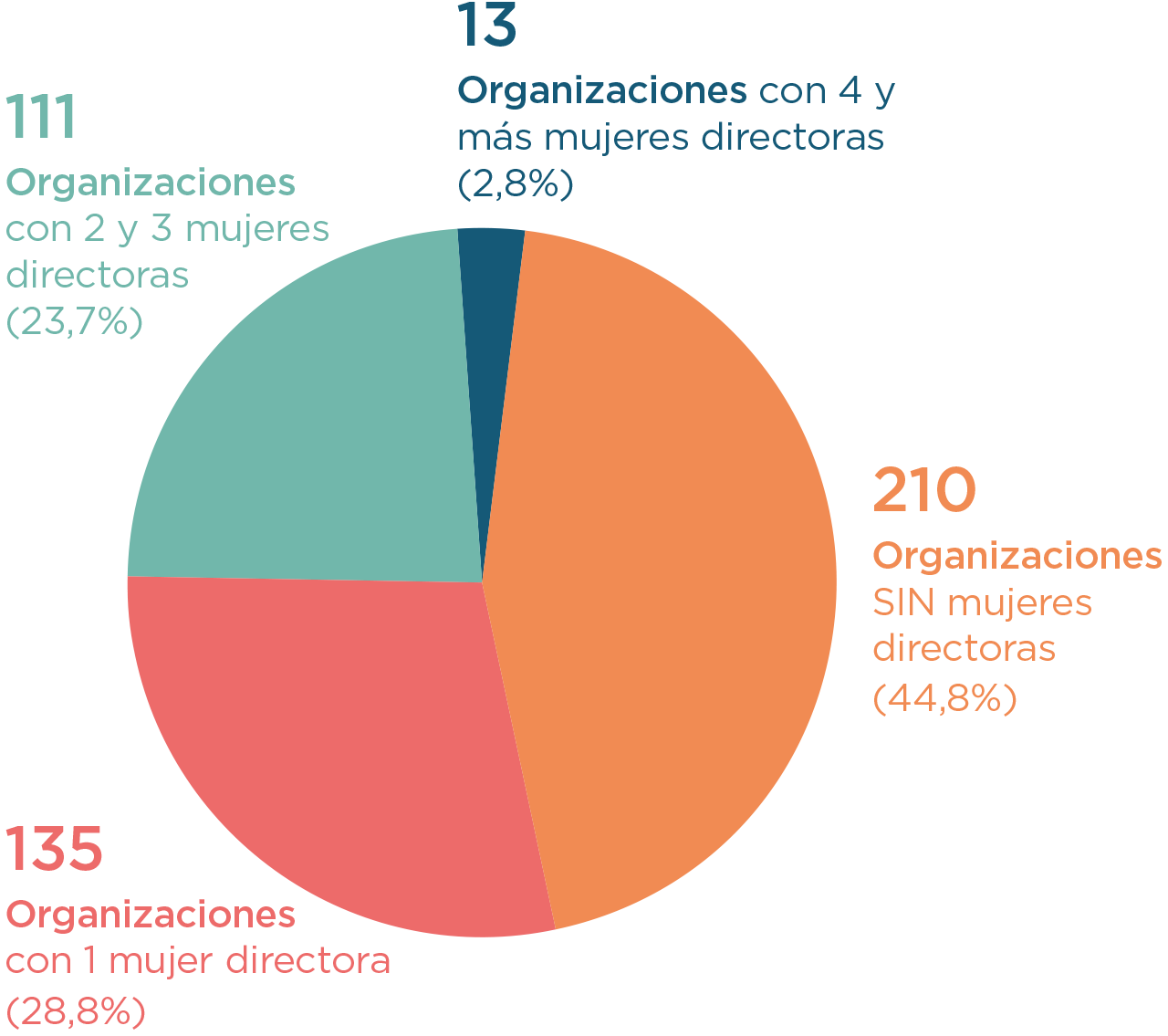 En cuanto a las entidades que no cuentan con mujeres directoras, la cifra es de 210, representando el 44,8% del total. Estas organizaciones tienen 6,2 asientos directivos disponibles en promedio y un máximo de 15 directores, siendo todos ocupados por hombres.