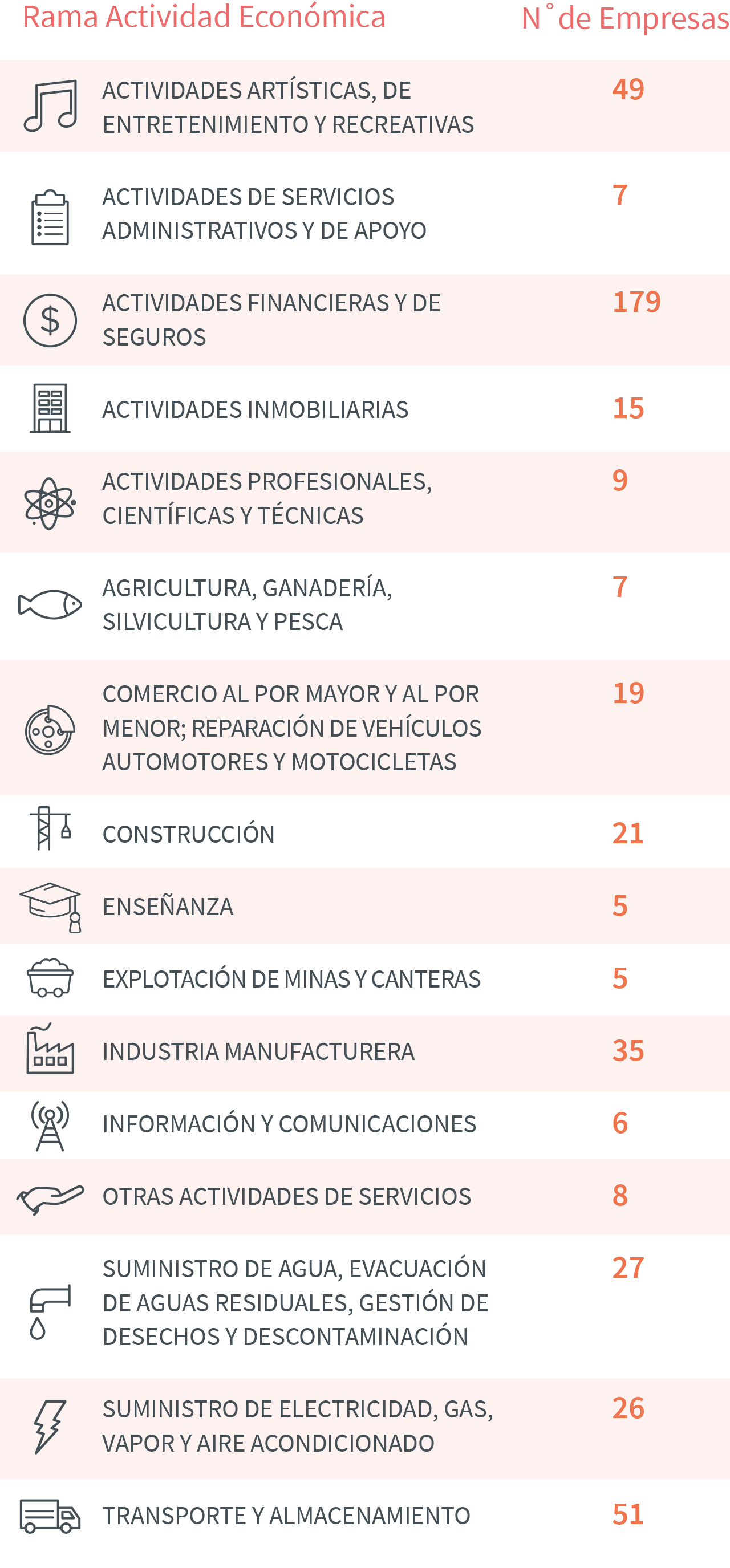En esta versión del reporte, al igual que en la anterior, se presentan 16 rubros que fueron identificados a partir del registro de las entidades analizadas en el Servicio de Impuestos Internos (SII). Los sectores con la menor cantidad de empresas son Enseñanza y Explotación de Minas y Canteras con 5 entidades. Por otro lado, Actividades Financieras y Seguros vuelve a ser el rubro con mayor cantidad de organizaciones, esta vez con 179 (véase Cuadro 2).
