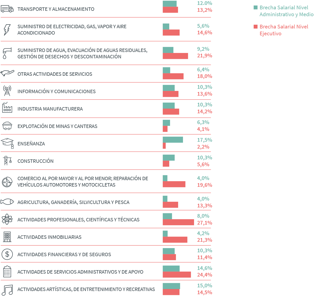 A Nivel Administrativo y Medio, los rubros con mayores brechas salariales declaradas fueron Enseñanza (17,5%), Actividades de servicios administrativos y de apoyo (14,6%) y Transporte y almacenamiento (12%). Por el contrario, Comercio al por mayor y al por menor, reparación de vehículos automotores y motocicletas (4%); Agricultura, ganadería silvicultura y pesca (4%), y Actividades inmobiliarias (4,2%) son las ramas de actividad económica con menor brecha salarial reportada a ese nivel.