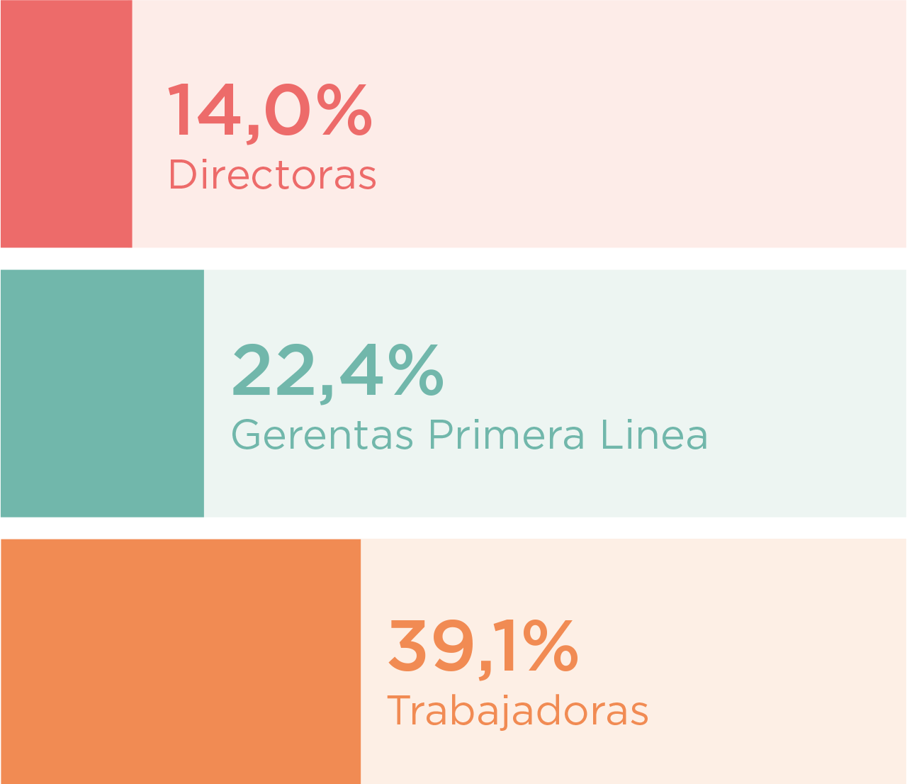 Para el año 2022 se reportaron 337.799 mujeres en las 469 entidades consideradas, es decir, el 39,1% del total de personas trabajadoras. Por su parte, la participación de mujeres en gerencias de primera línea alcanzó un 22,4%. En los directorios, el nivel más alto de responsabilidad en las organizaciones, la participación de mujeres es menor que en los niveles anteriormente analizados, alcanzando apenas un 14% del total.