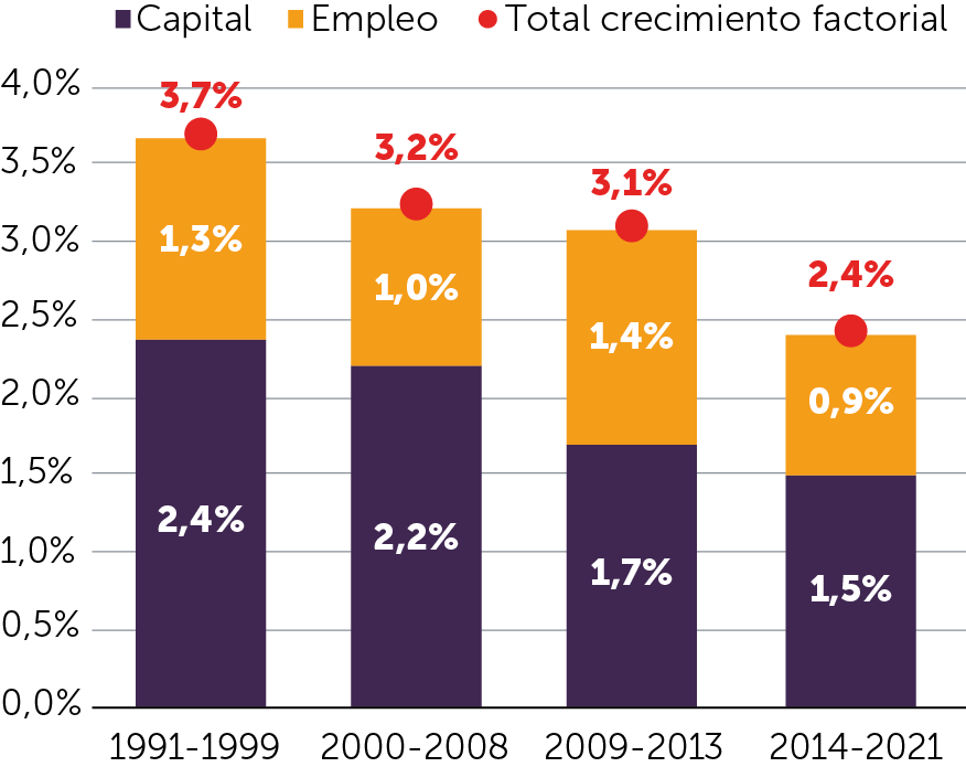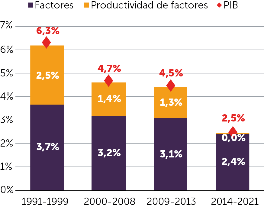 En Chile el crecimiento de la Productividad se ha desacelerado significativamente, siendo la principal causa del deterioro de la expansión económica. En la década del noventa la Productividad multifactorial crecía en torno a 2,5% promedio por año, y los factores productivos por sobre el 3,5%, lo que permitió generar crecimientos del producto interno bruto (PIB) No Minero superiores al 6% promedio por año. Posteriormente el crecimiento factorial ha seguido una trayectoria declinante que le ha significado un recorte del orden de 1,5 puntos porcentuales (pp.) en su contribución al crecimiento promedio del PIB No Minero entre la década del 90 y el período 2014-2020.