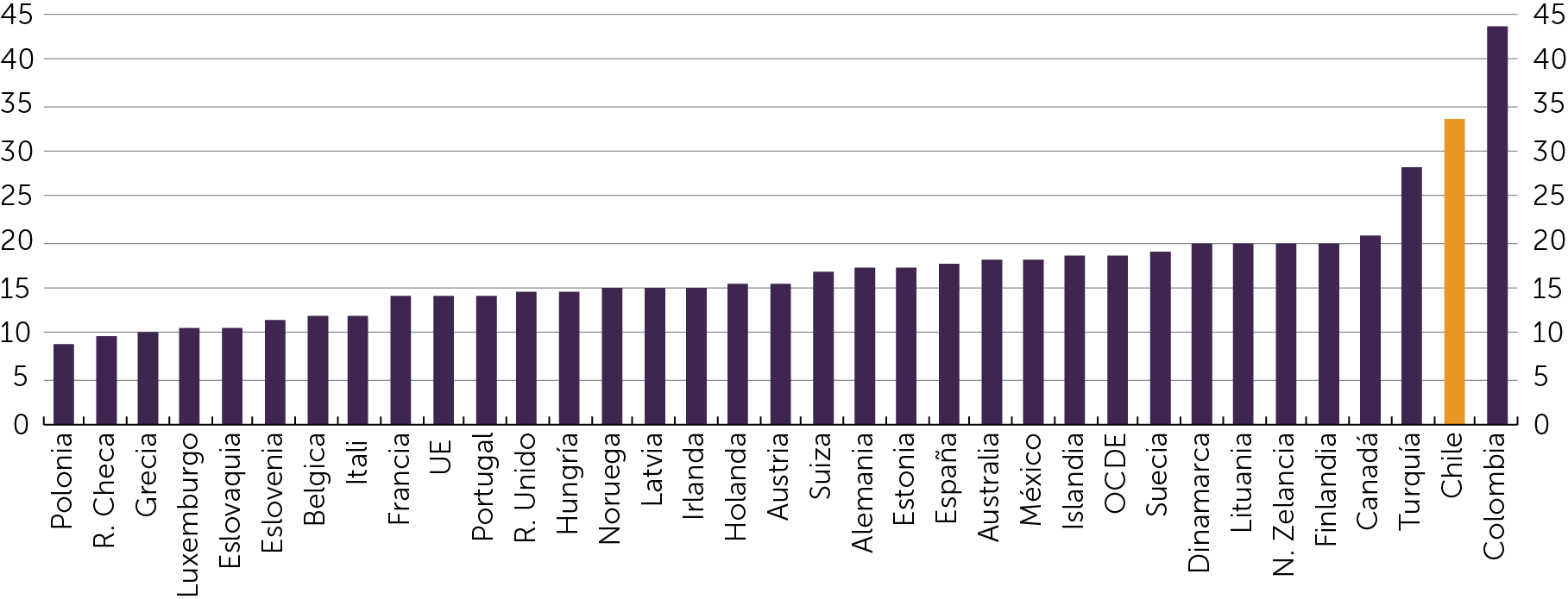 Todos estos elementos incluidos en el diagnóstico son consistentes con los hallazgos a nivel de firmas, que sugieren que el deterioro en la Productividad ocurre principalmente debido a deficiencias en la asignación de recursos entre firmas incumbentes (participantes), más que por la dinámica de entrada y salida de ellas del mercado[2]. La economía presentaría limitaciones para que los recursos que se reasignan entre firmas se efectúen en forma eficiente, es decir, migrando hacia firmas cuya productividad es mayor o está creciendo. Esta reasignación ocurriría de forma ineficiente, en un escenario donde la movilidad factorial o tasa de rotación laboral no es un cuello de botella (Gráfico VIII.3)