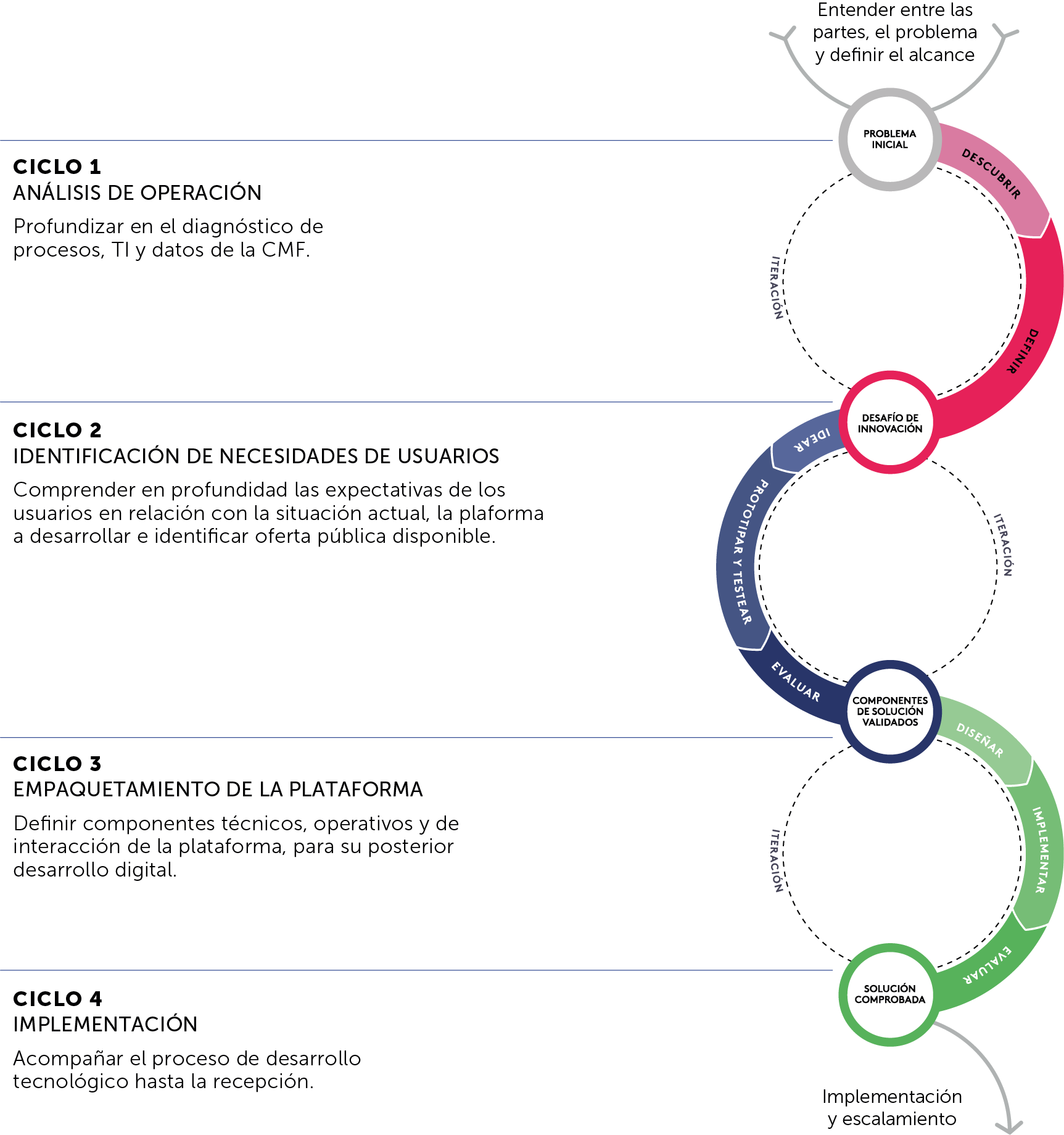 El primer ciclo tiene por objetivo analizar la operación identificando las brechas de los procesos actuales para la integración de información de deuda, realizando una estimación preliminar del costo y esfuerzo que implica el desarrollo de una plataforma para la integración de datos, e iniciando la gestión del cambio para alinear a los equipos de trabajo de la CMF. Con estos antecedentes, se acuerda entregar un informe del diagnóstico de procesos, datos y la capacidad tecnológica de la institución y el costo estimado para definir el financiamiento de la iniciativa de innovación.