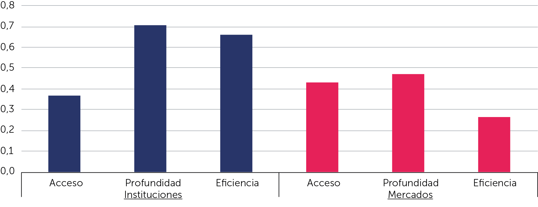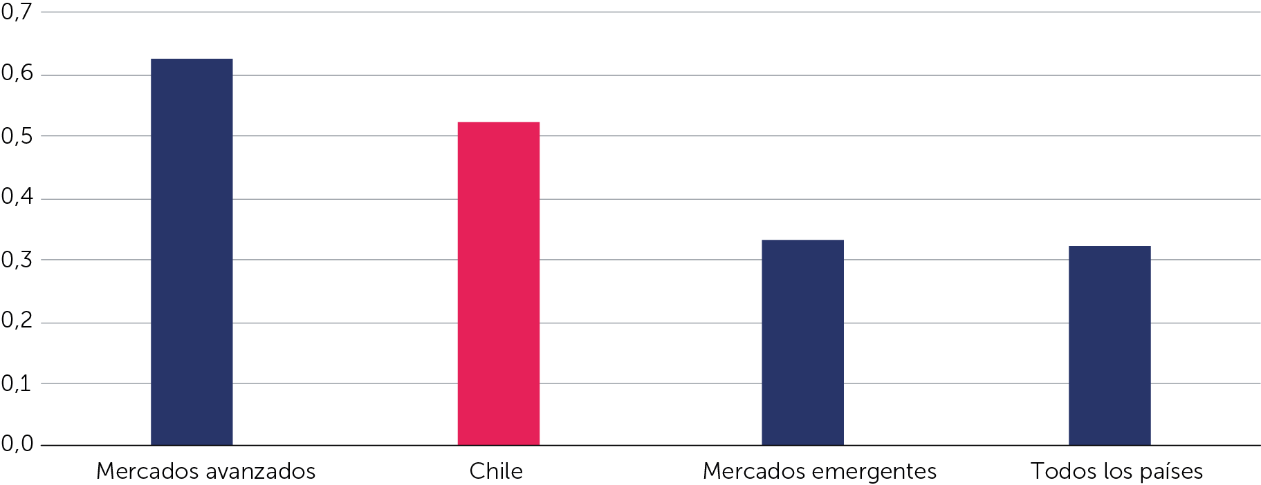 En términos comparativos, Chile tiene un desarrollo financiero situado por sobre el promedio mundial y el de los mercados emergentes. De acuerdo con el Índice de Desarrollo Financiero elaborado por el Fondo Monetario Internacional, que mide el desarrollo en términos de profundidad, acceso y eficiencia del mercado e instituciones financieras, Chile se encuentra por sobre el promedio mundial y el promedio de los países emergentes, situándose en Latinoamérica en segundo lugar, solo por debajo de Brasil (Gráfico IX.2). En particular, el componente que más destaca en Chile es la profundidad de sus instituciones (Gráfico IX.3).