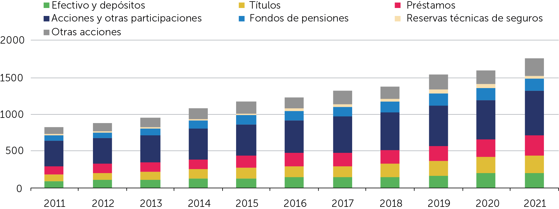 Los activos financieros de la economía nacional se duplicaron en la última década. Según información del Banco Central de Chile, en los últimos 10 años los activos financieros pasaron de $830 billones en 2011 a $1.749 billones en 2021 (Gráfico IX.1). La mayor proporción de activos financieros corresponde a las acciones y participaciones, las que representaron a cierre del año 2021 un 35% de los activos financieros totales.