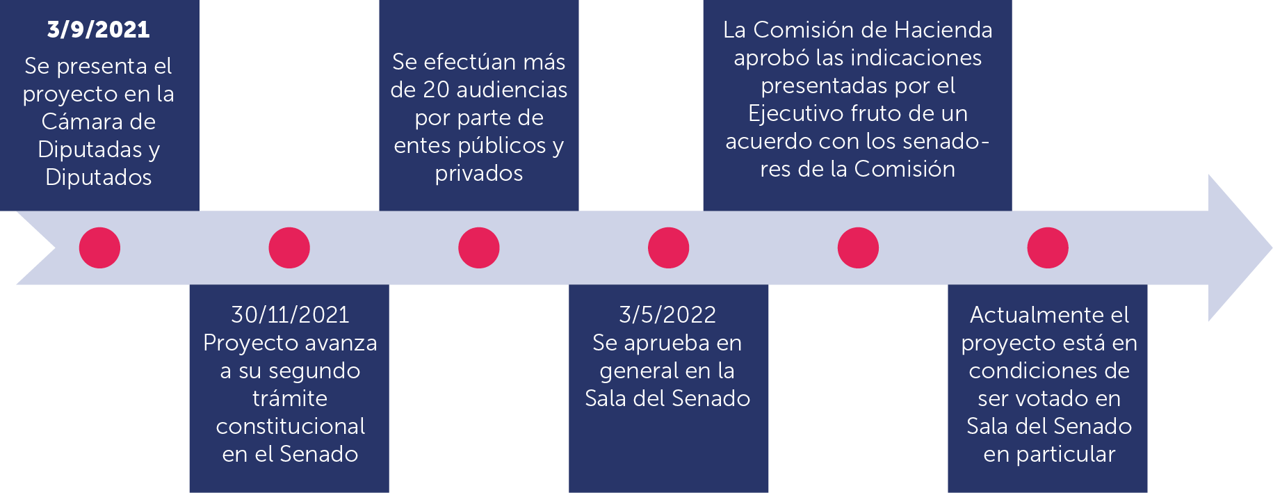 Actualmente el proyecto se encuentra en su segundo trámite constitucional en el Senado. El proyecto ingresó al Congreso el 3 de septiembre de 2021, y luego de ser aprobado por la Cámara de Diputadas y Diputados y en general por el Senado, avanzó a su segundo trámite legislativo en la Comisión de Hacienda del Senado. En esta instancia, la presente administración presentó 17 indicaciones, emanadas de una mesa técnica con asesores de todos los miembros de la Comisión que buscaban mejorar ciertos aspectos del proyecto. Actualmente, el proyecto está listo para ser votado en particular en la sala del Senado.