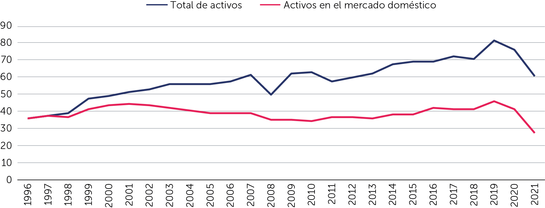 El Ministerio de Hacienda se encuentra impulsando una serie de iniciativas con el propósito de promover un mercado de capitales más profundo, estable e inclusivo. En los últimos años, la profundidad del mercado de capitales se vio afectada en el marco de la aprobación de los tres retiros de fondos de pensiones, lo que implicó una caída cerca del 20% del PIB en términos de activos administrados (Gráfico IX.4). Debido a lo anterior, el Ministerio de Hacienda ha estado durante este año promoviendo una serie de iniciativas tanto para recuperar la profundidad del mercado de capitales y la base de ahorros de largo plazo perdidos, elementos esenciales para avanzar en el desarrollo de un mercado de capitales que sea más profundo, estable e inclusivo.