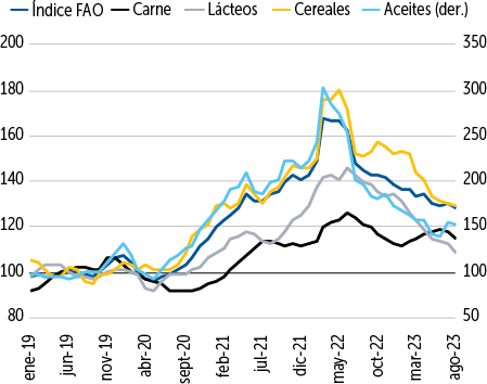 [1] Índice de precios de los alimentos de una canasta de productos alimenticios de cinco grupos de productos básicos de la Organización de las Naciones Unidas para la Alimentación y la Agricultura (FAO, por sus siglas en inglés).