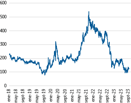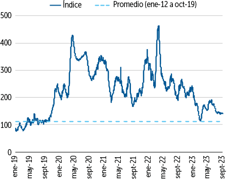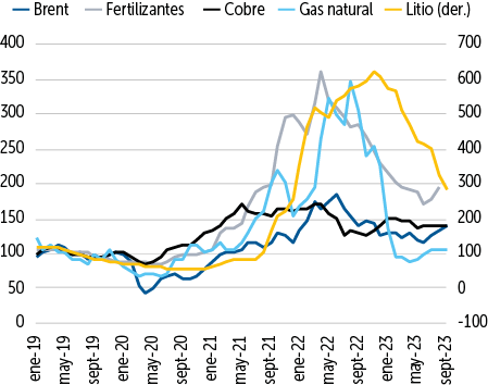 Los precios de las materias primas, que alcanzaron máximos históricos en 2022 debido a la recuperación de la actividad tras la crisis sanitaria y a la invasión rusa, disminuyeron de forma importante a partir del tercer trimestre de 2022, aunque recientemente han rebotado algunos casos. Primero, el petróleo Brent, que aumentó hasta un 57% en 2022 respecto al valor promedio de diciembre de 2021, ha disminuido un 23% desde el máximo alcanzado en 2022; no obstante, ha presentado alzas importantes entre julio y septiembre (Gráfico 1.1.3). Segundo, los precios de los alimentos[1], que lograron un máximo en marzo de 2022 con un alza de 19% respecto de fines de 2021, han bajado un 24% desde su peak (Gráfico 1.1.4). Tercero, el precio del cobre, que experimentó crecimientos importantes entre noviembre de 2022 y enero de este año por las expectativas de una mayor demanda china tras el fin a de la política Covid Cero, se ubica actualmente en torno a 3,8 dólares la libra. Finalmente, el precio del litio ha descendido un 55% desde el máximo alcanzado en noviembre de 2022, pero ubicándose aún muy por sobre el promedio observado entre 2018 y 2019.