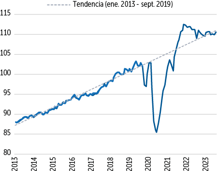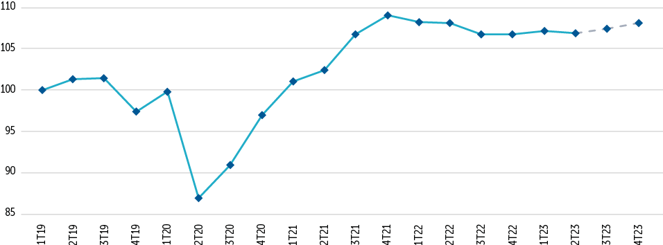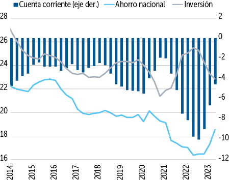 La política monetaria restrictiva, el menor gasto fiscal, el ajuste de la demanda interna, el traspaso del menor nivel de tipo de cambio durante el primer semestre de 2023 y la caída de los precios internacionales de los alimentos y de la energía han contribuido a la disminución de la inflación total y, en menor medida, de la inflación subyacente, la que todavía está captando el efecto rezagado de la alta inflación previa a través de la indexación. El retorno de la economía al punto de equilibrio continuará a lo largo de 2023, y hacia fines de este año superará el nivel de 2022 (Gráfico I.2.11). En línea con la política monetaria contractiva necesaria para lograr la convergencia inflacionaria, se estima que la actividad cierre 2023 con un crecimiento cercano a cero, volviendo en los próximos años a crecimientos en torno a su tendencia. A su vez, los mercados validan una perspectiva de inflación a la baja, apuntando a que a diciembre de este año se ubique en torno a 4% y que durante el próximo año alcance 3%. Los avances en el control de la inflación y la consolidación fiscal permitieron que Chile comenzara a reducir las tasas de interés antes que otros países, normalización que será un apoyo en los desafíos pendientes como la recuperación del empleo y la inversión. Por el lado externo, el déficit de cuenta corriente finalizará el año incluso por debajo de su promedio histórico de 3,5%.