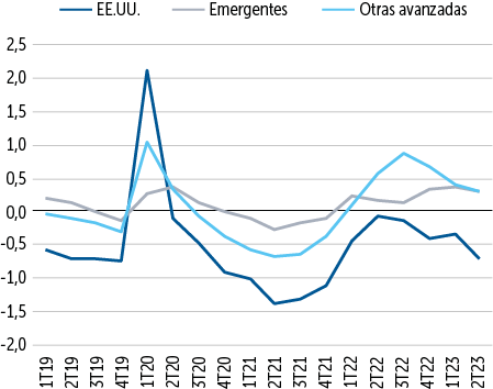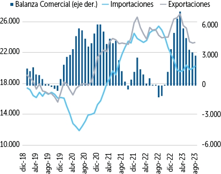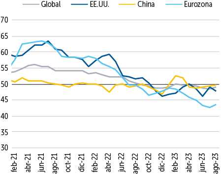A medida que 2023 avanzaba, la economía de Estados Unidos demostró más resiliencia de la esperada, caracterizada por la fortaleza del mercado laboral y del consumo, conteniendo las tensiones bancarias. Durante el primer y segundo trimestre la economía creció, la creación de empleo superó las expectativas y los salarios reales volvieron a aumentar. En Latinoamérica, las recientes cifras muestran también una mayor resiliencia de la región. China igualmente sorprendió al alza en el primer trimestre, aunque con un enfoque en servicios más que en bienes transables, lo que impactó en el sector del cobre. No obstante, en los meses posteriores, los indicadores económicos reflejaron un declive significativo respecto a las expectativas, mostrando que el dinamismo observado tras la reapertura fue de carácter transitorio. En la Eurozona, la actividad registró un crecimiento casi nulo en el primer y segundo trimestre; y los datos más recientes dan cuenta que la debilidad continúa.