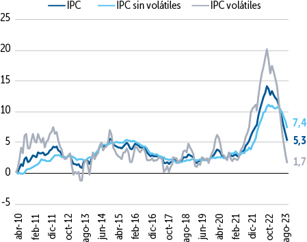 Las perspectivas de inflación más positivas se dan en el contexto de una inflación total que alcanzó un punto máximo en agosto del año pasado, descendiendo 8,8 puntos porcentuales desde entonces para ubicarse en 5,3% en agosto de este año (Gráfico I.2.10). La tasa de política monetaria llegó a su mayor nivel en octubre del 2022 y se mantuvo hasta julio de este año cuando el Consejo del Banco Central decidió iniciar el proceso de reducción de tasas. Dentro del horizonte de política monetaria, en torno a 2 años, las expectativas de inflación están ancladas a la meta de 3% del Banco Central.