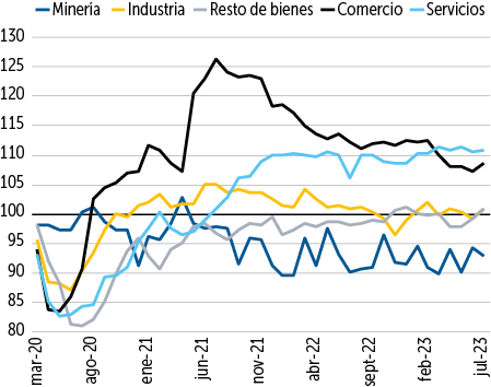 A nivel de sectores, el comercio se ha reducido en el transcurso del año (Gráfico I.2.3), pero esta contracción no ha arrastrado a los otros sectores: los servicios y la industria han mostrado un buen desempeño durante el año, principalmente en el primer trimestre, y aunque resto de bienes no inició bien el año, ha logrado un importante repunte en los últimos meses de la mano de un mayor valor agregado en la generación eléctrica. Por su parte, la minería ha mostrado una fuerte volatilidad, manteniéndose bajo los niveles previos a la pandemia. (Gráfico 1.2.3).