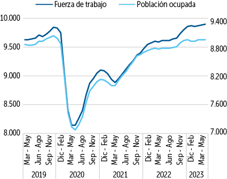 El mercado laboral se ha mantenido resiliente durante 2023, con una participación laboral que sigue recuperándose. La creación de empleo ha continuado en los últimos meses, aunque a un ritmo menor, en línea con el proceso de desaceleración de la actividad, y se ha ido trasladando desde asalariados formales a empleos por cuenta propia. La tasa de desempleo desestacionalizada se ha mantenido en torno al 8,5% desde comienzos de este año, lo que, si bien la mantiene lejos de los dos dígitos, excede su promedio histórico. En los últimos meses se ha observado un alza de la fuerza de trabajo (Gráfico 1.2.7), mientras que la demanda laboral se ha debilitado; pero los salarios reales continúan mejorando, consistente con la reducción de la inflación (Capítulo IV). Con ello, la masa salarial ha crecido en el año, lo que le ha puesto piso a la contracción del consumo privado.