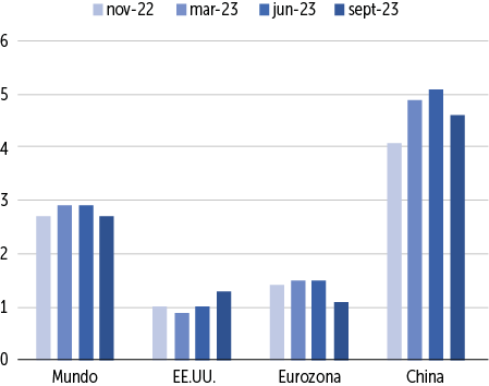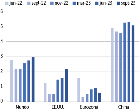 Las expectativas de crecimiento a nivel global para 2023 se han corregido al alza y se ubican por sobre las proyecciones de 2022, observándose heterogeneidad entre los países (Gráfico I.1.5). Según el Economic Outlook de la Organización para la Cooperación y el Desarrollo Económico (OCDE) de septiembre, a nivel global se espera un crecimiento anual de 3% para este año, levemente por debajo del crecimiento efectivo del 2022 (3,3%). A nivel de países, para Estados Unidos las estimaciones se ajustaron desde un 1,6% en junio hasta un 2,2% en septiembre (2022: 2,1%). En contraste, para la Eurozona se pronostica una expansión de 0,6%, inferior a lo proyectado en junio y por debajo del crecimiento que tuvo el 2022 (3,4%). Por el lado de China, las expectativas se ajustaron a la baja hasta un 5,1% (2022: 3%). Finalmente, para 2024 las proyecciones de expansión global se ajustaron levemente a la baja, desde un 2,9% en marzo hasta un 2,7% en septiembre, con un menor crecimiento para la Eurozona y China (Gráfico I.1.6).