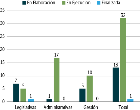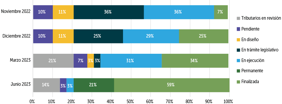 El avance de las medidas ha sido significativo, ya que el 80% se encontraban totalmente completadas a junio de 2023, de la cuales 59% están finalizadas y el restante 21% corresponde a aquellas con ejecución permanente, como instancias de cooperación u operación (Gráfico III.1.1). Sólo un 3% de las medidas están actualmente en ejecución a la espera de ser finalizadas y otro porcentaje similar están pendientes de implementación. Un 14% corresponde a incentivos tributarios a la inversión, los cuales no se han implementado dado que originalmente estaban incluidos en el proyecto de Reforma Tributaria.