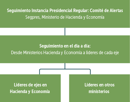 Actualmente, la Agenda cuenta con distintas instancias de seguimiento de carácter interministerial (Cuadro III.2.1). En primer lugar, una instancia en la que participan Presidencia, los Ministerios de Secretaría General de la Presidencia (Segpres), Hacienda, y Economía. En ella se informan de manera bimestral los avances de la Agenda a nivel general. Adicionalmente, el seguimiento regular funciona en conjunto a un Comité de Alertas, cuyo propósito es generar espacios de colaboración entre los distintos organismos participantes y resolver problemas que surjan durante la implementación de las medidas de la Agenda. Por último, el seguimiento del día a día es realizado por los Ministerios de Hacienda y Economía, los cuales se reúnen periódicamente con los líderes de cada eje, para conocer el avance de cada medida en particular.