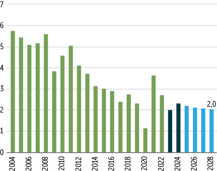 Las previsiones del PIB no apuntan a cambios significativos al alza en la economía chilena. Las cifras de crecimiento del PIB Tendencial para los próximos años reportadas por el Comité Consultivo del PIB No Minero Tendencial (Capítulo II.1) en su última estimación se ubican alrededor de 2,1% para el período 2023-2028 (Gráfico III.2), algo inferior al resultado efectivo desde 2014 a la fecha. Estas cifras son cercanas a la última proyección de diciembre de 2022 del Banco Central, el que estima una capacidad de expansión de mediano plazo de la actividad no minera para el periodo 2023-2032 de 2,2%.