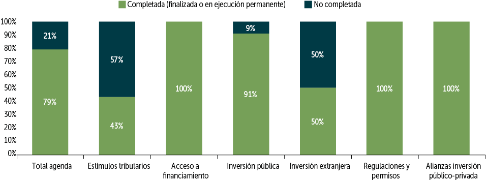 Respecto a las medidas de la agenda que han sido llevadas a cabo, se destacan tres aprobadas en el eje de estímulos tributarios, como la extensión de la reducción del Impuesto de Primera Categoría para las Pymes a 10% durante 2023 y a 12,5% durante 2024; los incentivos a la inversión minera, donde se considera la depreciación y la inclusión de los gastos de puesta en marcha de un proyecto en los costos para determinar la base imponible; y la eliminación de cambios tributarios de contratos de leasing. En lo que respecta a acceso a financiamiento, destacan la aprobación de la Ley de Garantía Estatal para el pie hipotecario en la adquisición de la primera vivienda; la extensión del porcentaje de cobertura del seguro de remate hasta el 100% del financiamiento de la compra de viviendas nuevas en caso de remate del inmueble y un programa de créditos de segundo piso de la Corporación de Fomento de la Producción (CORFO) que ha otorgado financiamiento a más de 60 mil empresas por más de $150 mil millones. En el ámbito de regulaciones y permisos, las tres medidas del eje ya han sido finalizadas, como la incorporación de un fondo para el fortalecimiento de servicios críticos en la tramitación de proyectos, y el fortalecimiento de la Oficina de Grandes Proyectos (OGP), ambas incluidas en la Ley de Presupuestos 2023. Por último, dentro del eje de mejoras a la inversión pública se incluye la actualización de las Normas, Instrucciones y Procedimientos (NIP); cambios en los procesos de autorización de conservaciones y la incorporación de herramientas de confirming por parte de BancoEstado.
