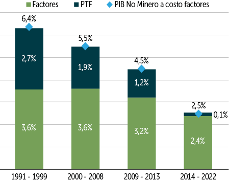 Los elementos que inciden en este descenso del crecimiento proyectado para los próximos años son variados. Entre ellos, una trayectoria de los factores productivos que seguirán afectados por las menores tasas de expansión del stock de capital, el envejecimiento poblacional y un estancamiento en la productividad total de factores, en particular aquella de los sectores no mineros, que en lugar de crecer a ritmos del orden de 2,7% como en la década de los 90, muestra valores cercanos a cero desde 2014 en adelante.
