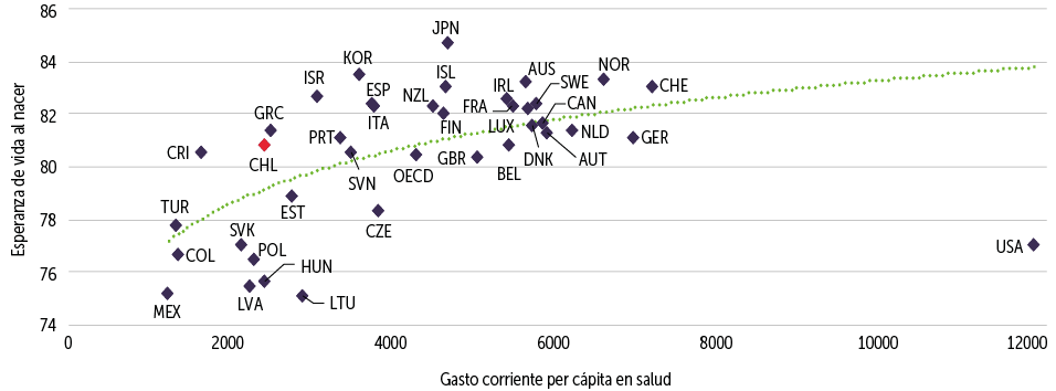 Nota: Los datos de gasto son provisionales para Israel, Japón, Lituania y Suecia. Se estima el valor de Nueva Zelanda. Se estima la esperanza de vida para el Reino Unido y Japón. La esperanza de vida de Turquía utiliza datos de 2019. CHL corresponde a Chile.