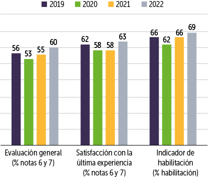 Evolución de la evaluación general, satisfacción con la última experiencia e indicador de habilitación (2019-2022)